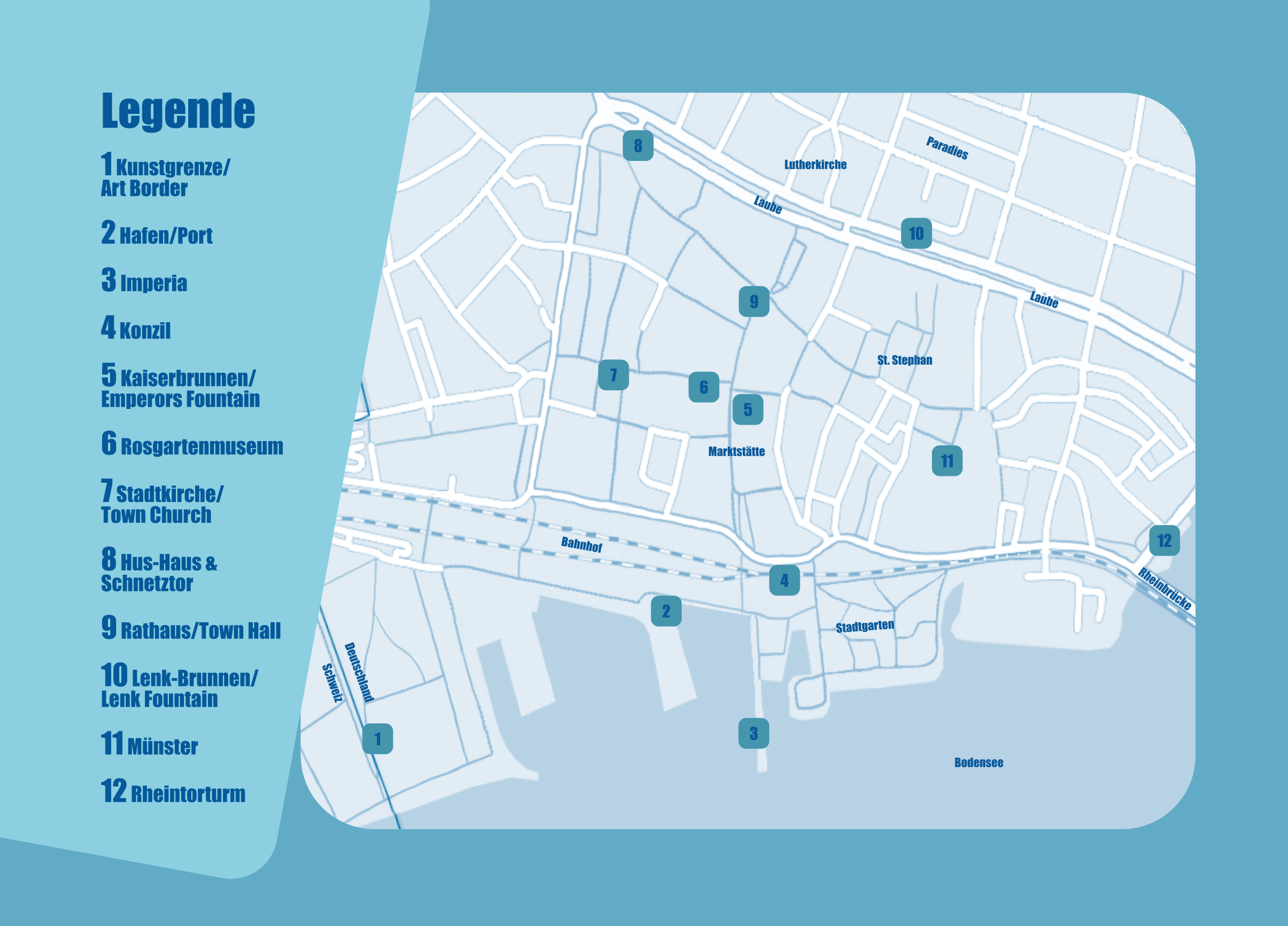 Die Idee bestand darin, einen Stadtplan mit einigen besonderen Sehenswürdigkeiten in Konstanz zu erstellen. Zu jedem ausgewählten Ort kann eine kurze Audiodatei per qr-Code aufgerufen werden, welche kurz und knapp die wichtigsten Fakten vermittelt. Es steht jeweils ein deutscher und ein englischer Podcast zur Verfügung.
