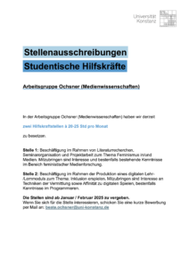 Die Stellen sind ab Januar/ Februar 2025 zu vergeben. Wenn Sie sich für die Stelle interessieren, schicken Sie eine kurze Bewerbung per Mail an: beate.ochsner@uni-konstanz.de