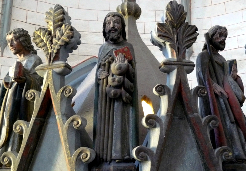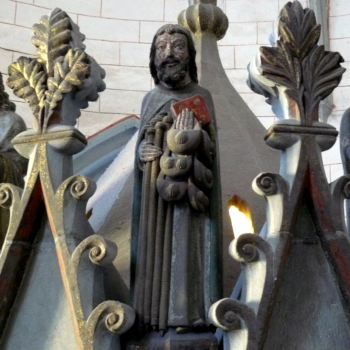 Die Mauritiusrotunde wurde seit jeher von Pilgern besucht. Auf ihren Besuch war bereits Konrads Gründungsbau ausgelegt. Im Mittelalter wurde Konstanz bedeutendster Pilgersammelpunkt Süddeutschlands auf dem Weg nach Rom, Jerusalem und Santiago. Dass die Rundkirche als Gnadenort von Wallfahrern besucht wurde, legt der als Pilger dargestellte Jakobus am Heiligen Grab nahe: Er hält sieben ... mehr anzeigenDie Mauritiusrotunde wurde seit jeher von Pilgern besucht. Auf ihren Besuch war bereits Konrads Gründungsbau ausgelegt. Im Mittelalter wurde Konstanz bedeutendster Pilgersammelpunkt Süddeutschlands auf dem Weg nach Rom, Jerusalem und Santiago. Dass die Rundkirche als Gnadenort von Wallfahrern besucht wurde, legt der als Pilger dargestellte Jakobus am Heiligen Grab nahe: Er hält sieben Pilgerstäbe und mit Jakobsmuscheln verzierte Taschen in den Händen.Die Möglichkeit für Pilger, in der Rotunde Objekte zu verehren, wurde immer weiter ausgebaut. Sie konnten das gotische Grab umrunden und dabei auch vor der weißen Stein-Reliquie innehalten und deren (vermeintliche) Herkunft aus Jerusalem bestaunen. Eine Kniebank erlaubte es sogar, den Stein und das leere Grab Christi, das sich im Inneren an dieser Stelle befindet, von außen küssend zu verehren. Der Zentralbau wurde zum Ort der Partizipation am ‚Heiligen’. Dies belegt die Überlieferung eines abergläubischen Brauches im 15. Jahrhundert: Das gemeine Volk verehrte auch einen von Bischof Konrad in die Rotunde gebrachten römischen Inschriftenstein, indem sie ihn berührten und sich danach über das Gesicht fuhren, um seine angebliche Heilskraft zu übertragen.