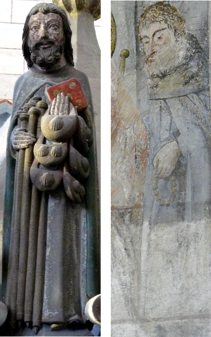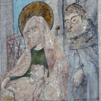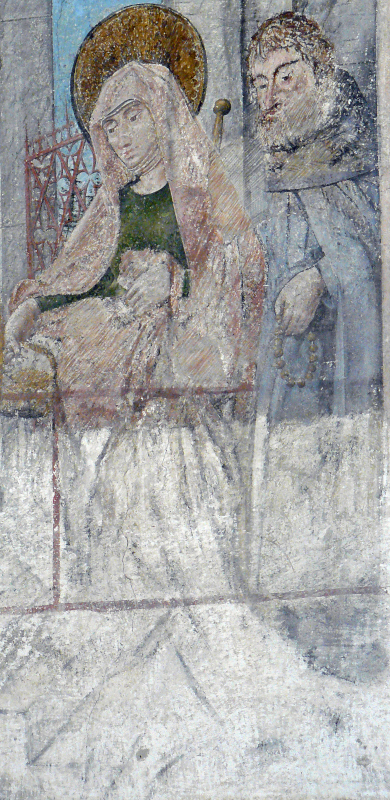 Auch das Wandbild von 1452 spricht Pilger direkt an: Dies zeigt die auffällige Ähnlichkeit Joachims mit der Jakobus-Pilgerfigur am Grabbau. Joachims Rosenkranz und Annas Gabenkorb, dem sie dem Priester reicht, kennzeichnen die beiden als fromme und devote Pilger bzw. Kirchgänger. Ihr Vorbild ruft den Betrachter auf, ebenfalls Opfergaben darzubringen und den Rosenkranz zu beten. Im Gegenzug konnte er so vermutlich den Sündenerlass der Gregorsmesse erlangen und von der visuellen Gnadenwirkung des Schmerzensmanns profitieren. Die Rotunde war im Spätmittelalter also ein Ort der diesseitigen Gnadenerfahrung mit einem vielfältigen Angebot: Visuell, haptisch sowie performativ konnten Laien und Pilger hier Gnade erfahren, erwerben und verinnerlichen. weniger anzeigen