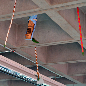 Wer den Blick durch den Raum D 522 schweifen lässt, dem fallen zuerst die mit Spiralen bemalten farbigen Spazierstöcke ins Auge, die von der Decke hängen. Zu den auf einzelne Deckenquadrate verteilten Stöcke kommen zusätzliche Fundgegenstände: eine mit Zeitungspapier tapezierte Fußplastik in einem himmelblau bemalten Polio-Stützgestell zum Beispiel oder, als Begrenzungen der ... mehr anzeigenWer den Blick durch den Raum D 522 schweifen lässt, dem fallen zuerst die mit Spiralen bemalten farbigen Spazierstöcke ins Auge, die von der Decke hängen. Zu den auf einzelne Deckenquadrate verteilten Stöcke kommen zusätzliche Fundgegenstände: eine mit Zeitungspapier tapezierte Fußplastik in einem himmelblau bemalten Polio-Stützgestell zum Beispiel oder, als Begrenzungen der Fensterrahmen eingesetzt, Reste von farbigem Plexiglas. Diese stammen vom ursprünglichen, von Otto Piene entworfenen Dachaufbau des Eingangsbereichs. Das von Beyerle geschaffene bunte Ensemble aus Fundstücken verleiht dem schlichten, grauen Raum einen lebendigen, individuellen Charakter.