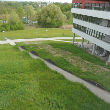 Der Innenhof der Sozialwissenschaften ist der Ausgangspunkt für eine groß angelegte Landschaftsverformung, die sich an der amerikanischen Land-Art orientiert. Ladislav Minarik ließ den leicht abfallenden Hang ausgehend von der Gebäudefront mit parallel angelegten Bodenwellen gliedern, die sich in Richtung der Talaue des angrenzenden Hockgrabens hin ‚ergiessen’.In der Bewegungsrichtung ... mehr anzeigenDer Innenhof der Sozialwissenschaften ist der Ausgangspunkt für eine groß angelegte Landschaftsverformung, die sich an der amerikanischen Land-Art orientiert. Ladislav Minarik ließ den leicht abfallenden Hang ausgehend von der Gebäudefront mit parallel angelegten Bodenwellen gliedern, die sich in Richtung der Talaue des angrenzenden Hockgrabens hin ‚ergiessen’.
