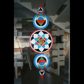 Beim Gang durch die sozialwissenschaftliche Bibliothek begegnet man zahlreichen Ornamentmalereien, die mit Schablonen und Industrielack auf die Glastüren angebracht sind. Die Malereien, die sich auf den Farbakkord Rot-Blau-Grün-Weiß-Schwarz beschränken, sind in ihrer Gestaltung ein Echo auf die plastischen Gebilde, die „zusammengesetzten Gehänge“, die Rolf Genz ein Jahr zuvor für ... mehr anzeigenBeim Gang durch die sozialwissenschaftliche Bibliothek begegnet man zahlreichen Ornamentmalereien, die mit Schablonen und Industrielack auf die Glastüren angebracht sind. Die Malereien, die sich auf den Farbakkord Rot-Blau-Grün-Weiß-Schwarz beschränken, sind in ihrer Gestaltung ein Echo auf die plastischen Gebilde, die „zusammengesetzten Gehänge“, die Rolf Genz ein Jahr zuvor für die gleichen Räume geschaffen hatte.Jedes Ornament hat eine einmalige Gestalt, doch gehorchen alle sechzehn im Aufbau dem gleichen Gestaltungsprinzip: Das Zentrum nimmt eine große, ornamental variierte Kreisfigur ein, die an eine Blüte erinnert. Diese Blütenform wird entlang der Vertikalen von zwei asymmetrischen Figuren, die sich jedoch spiegeln, gerahmt. In den sechszehn gemalten Ornamenten spielen drei Symmetrieachsen zusammen: Die Horizontale und die Vertikale werden spiegelsymmetrisch eingesetzt; die mittlere Figur hingegen, in der sich die Vertikale und die Horizontale kreuzen, ist meist punktsymmetrisch gestaltet.Zur künstlerischen Intervention von Rolf Gentz in der Bibliothek gehörten ursprünglich analog konzipierte Malereien auf den Lüftungsschächten. Diese mussten bei der Asbestsanierung entfernt werden.