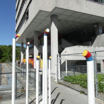 Das von Richard Bösch gestaltete Ensemble besteht aus 66, etwa mannshohen, weiß bemalten Stelen aus Stahlrohr. An einzelnen Stellen verdichten sich die individuell geformten Elemente zu dichteren Gruppen mit regelmäßiger Verteilung. An jedes der röhrenförmigen Elemente sind jeweils zwei bis drei kurze Teile angefügt, die immer die Farbfolge Blau-Rot-(Gelb) aufweisen. Diese sind ... mehr anzeigenDas von Richard Bösch gestaltete Ensemble besteht aus 66, etwa mannshohen, weiß bemalten Stelen aus Stahlrohr. An einzelnen Stellen verdichten sich die individuell geformten Elemente zu dichteren Gruppen mit regelmäßiger Verteilung. An jedes der röhrenförmigen Elemente sind jeweils zwei bis drei kurze Teile angefügt, die immer die Farbfolge Blau-Rot-(Gelb) aufweisen. Diese sind gegeneinander abgeknickt und bilden so Ansätze zu kleinen Bogen, die jeweils in unterschiedliche Richtungen weisen. Ein Element besitzt ein unregelmäßig geformtes Ende. Durch ihre Gestalt evozieren die Stelen einzeln, aber auch in ihrer jeweiligen Gruppierung das Phänomen des pflanzlichen Wachstums. Das „verkrüppelte“ Element war Böschs Reaktion auf die Empfehlung der Kunst-Kommission, die Monotonie des Ensembles zu durchbrechen.