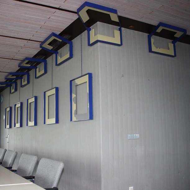 Nur nach Anmeldung im Sekretariat der Rektorin zugänglich.Das Ensemble besteht aus elf blau bemalten Bilderahmen aus Stahl, in die jeweils ein Passepartout in den Farbtönen Gelb und Grau eingelassen ist. Die nicht vollständig bemalten Bilderrahmen zeigen, anders als üblich, kein Bild, sie sind leer. Es sind die Rahmen selbst, die durch ihre besondere Anordnung und Gestaltung zum Werk werden: Fünf von ihnen hängen nebeneinander an Ketten, auf ... mehr anzeigenDas Ensemble besteht aus elf blau bemalten Bilderahmen aus Stahl, in die jeweils ein Passepartout in den Farbtönen Gelb und Grau eingelassen ist. Die nicht vollständig bemalten Bilderrahmen zeigen, anders als üblich, kein Bild, sie sind leer. Es sind die Rahmen selbst, die durch ihre besondere Anordnung und Gestaltung zum Werk werden: Fünf von ihnen hängen nebeneinander an Ketten, auf Augenhöhe des Betrachters; die restlichen sechs sind leicht versetzt darüber, im Winkel zwischen Wand und Decke, angebracht. Burkhart Beyerle wurde 1930 in Frankfurt am Main geboren. Sein Architekturstudium in Aachen unterbrach er, um eine Schreinerlehre zu machen. 1956 ging er als Architekt zur Bauverwaltung, wo er von 1964 bis 1993 für die Universität Konstanz zuständig war. Joseph Beuys empfahl seine Holzschnitte den Brüdern van der Grinten, die sie zum ersten Mal 1964 in ihrem Bauernhaus zeigten. Seine Beiträge für die so genannte Kunst an der Universität Konstanz entstanden spaßeshalber außerhalb des Kunst-am-Bau-Programms. Beyerle lebt und arbeitet in Konstanz. weniger anzeigen
