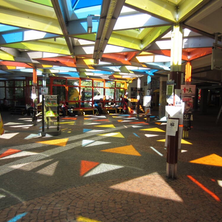 Das Lichtdach von Otto Piene besteht aus 211 lichtdurchlässigen Tetraedern in wechselnden Farbtönen. Zu den Primärfarben rot, gelb, blau tritt lila hinzu. Die Farbkörper des Daches bilden sich bei Tageslicht als buntes Mosaik aus farbigen Dreiecken auf dem Fußboden flächig ab. Pienes Dachgestaltung macht aus dem Eingangsbereich der Universität einen körperlich erfahrbaren Farbraum. ... mehr anzeigenDas Lichtdach von Otto Piene besteht aus 211 lichtdurchlässigen Tetraedern in wechselnden Farbtönen. Zu den Primärfarben rot, gelb, blau tritt lila hinzu. Die Farbkörper des Daches bilden sich bei Tageslicht als buntes Mosaik aus farbigen Dreiecken auf dem Fußboden flächig ab. Pienes Dachgestaltung macht aus dem Eingangsbereich der Universität einen körperlich erfahrbaren Farbraum. Wer bei hellem Wetter die Universität durch den Haupteingang betritt, wird in wechselndes farbiges Licht gehüllt.Das Dach bestand ursprünglich aus ähnlich geformten, vorfabrizierten Kunststoffelementen. Wegen Alterungsschäden und wegen der Feuergefährlichkeit des Materials musste 2004 die originale Konstruktion ersetzt werden. In Absprache mit dem Künstler wurde eine neue Lösung aus Isolierglas und eingelassenen farbigen Folien entwickelt, bei der die Licht- und Farbwirkung des ursprünglichen Daches bewahrt blieb.