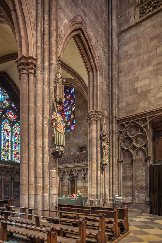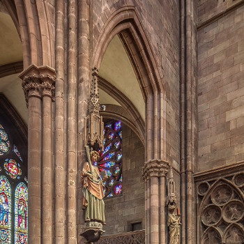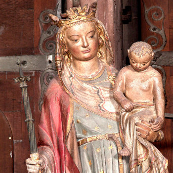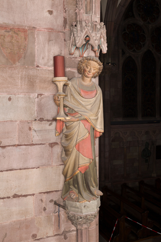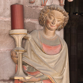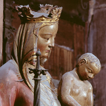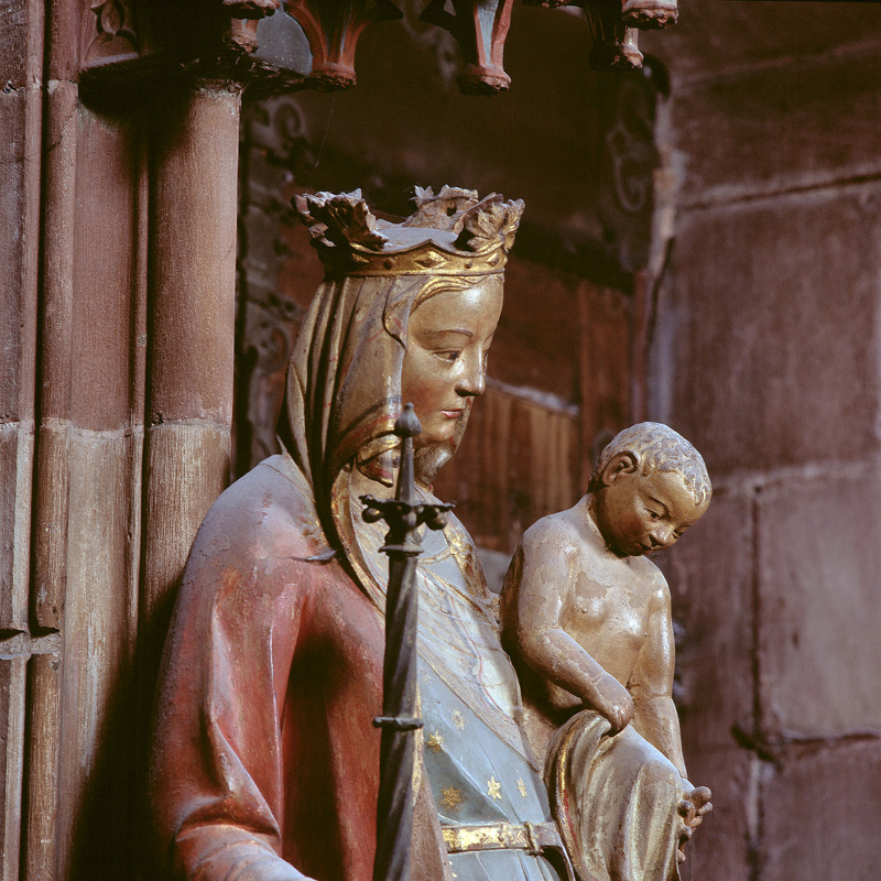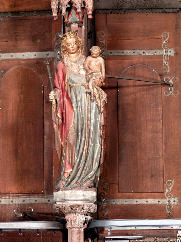 Die elegante, heute als „Sternenkleidmadonna“ bekannte Figur verdankt ihren Namen der um 1888/89 datierten Gewandbemalung. Maria trägt ein blaues mit goldenen Sternen besetztes Gewand, das unter der Brust von einem goldenen Gürtel gefasst wird. Darüber liegt ein über die Schulter fallender roter Mantel. Auf dem Kopf trägt sie einen goldenen Schleier mit Krone. In ihrem linken Arm ... mehr anzeigenDie elegante, heute als „Sternenkleidmadonna“ bekannte Figur verdankt ihren Namen der um 1888/89 datierten Gewandbemalung. Maria trägt ein blaues mit goldenen Sternen besetztes Gewand, das unter der Brust von einem goldenen Gürtel gefasst wird. Darüber liegt ein über die Schulter fallender roter Mantel. Auf dem Kopf trägt sie einen goldenen Schleier mit Krone. In ihrem linken Arm hält sie das nackte Jesuskind, dessen Unterkörper in ihren Schleier gehüllt ist.Außergewöhnlich für die damalige Zeit (um 1300) ist die Darstellung Mariens mit nacktem Jesuskind (vgl. Bildbox 3 – Detailansicht). In ihrer rechten hält sie ein Zepter. Umrahmt wird die Madonnenfigur von zwei Leuchterengeln, die auf zusätzlichen Sockeln an den Turmpfeilern stehen (vgl. Bildbox 03). Da der Abstand zwischen Marienfigur und Engeln gezwungen wirkt und die Turmpfeiler nachträglich verändert wurden, kann angenommen werden, dass der heutige Standort auf zusätzlichen Sockeln nicht dem ursprünglich geplanten Standort entspricht (vgl. Bildbox 04). weniger anzeigen
