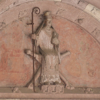 Das Relief zeigt eine auf einem Faltenstuhl sitzende Figur, die einen eisernen bischöflichen Krummstab und in der anderen Hand ein geschlossenes Buch hält. Der Faltstuhl ist mit Greifenfüßen und Löwenköpfen an den Enden verziert. Die Figur trägt Albe, Pallium und Mitra und die Füße stehen auf einem verzierten Sockel. Interessant ist, dass thronend eher Herrscher dargestellt wurden, während Bischöfe der Zeit eher stehend und mit Segensgeste gezeigt wurden.