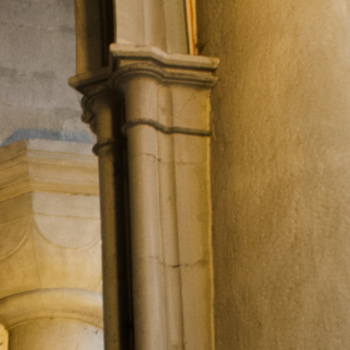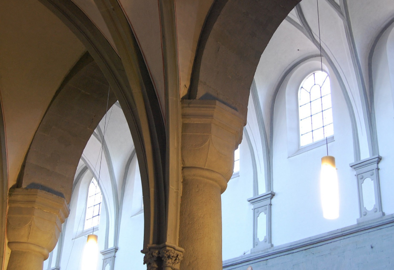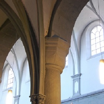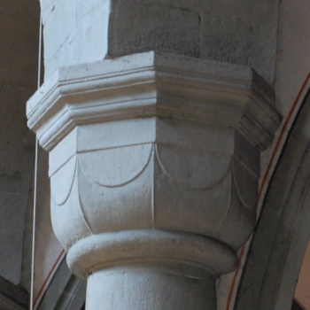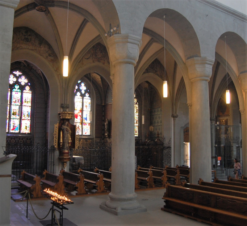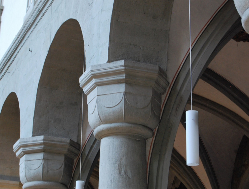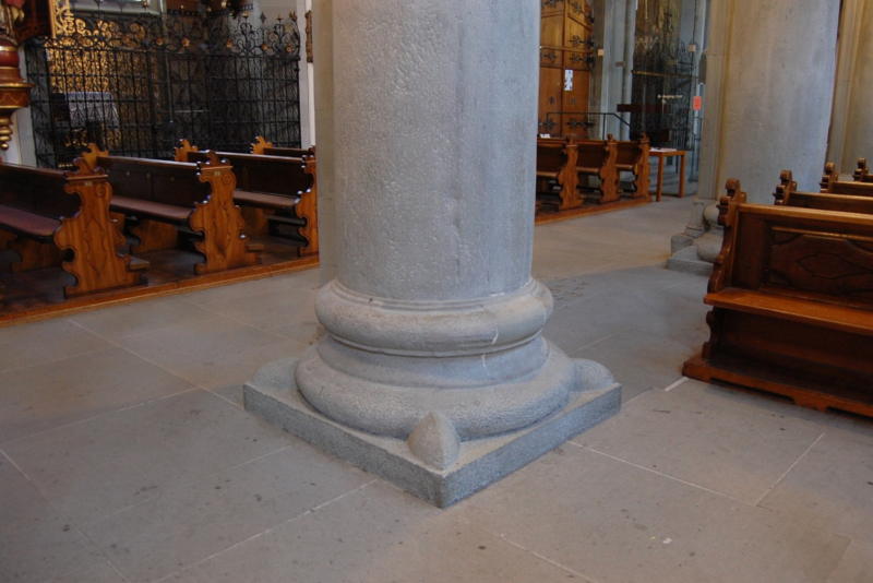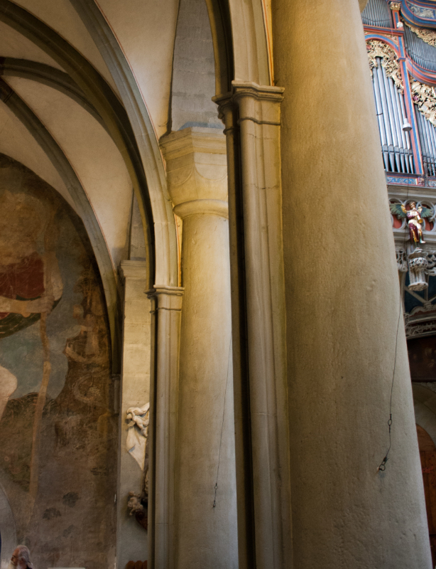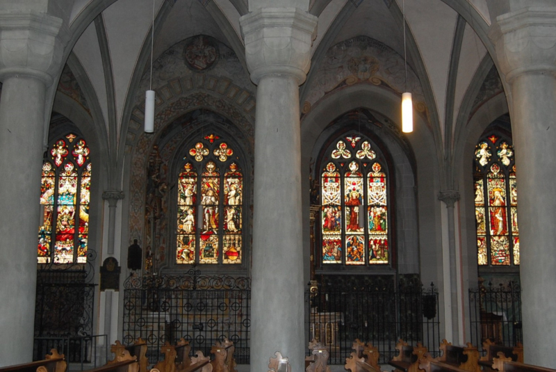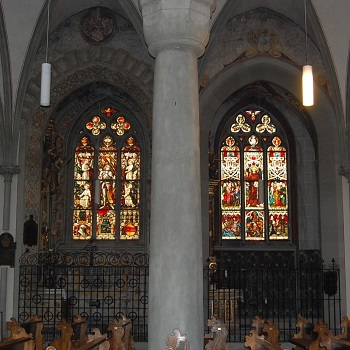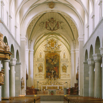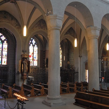 Im Langhaus des Münsters wurden im Laufe der Jahrhunderte immer wieder größere und kleinere Veränderungen vorgenommen. Die ältesten heute noch sichtbaren Bestandteile sind die Säulen des Mittelschiffs, deren Säulenschäfte jeweils aus einem Stück Sandstein gehauen wurden. Die Wand, die Mittelschiff und Seitenschiffe voneinander abgrenzt, ist in drei Zonen gegliedert. Die Säulen und ... mehr anzeigenIm Langhaus des Münsters wurden im Laufe der Jahrhunderte immer wieder größere und kleinere Veränderungen vorgenommen. Die ältesten heute noch sichtbaren Bestandteile sind die Säulen des Mittelschiffs, deren Säulenschäfte jeweils aus einem Stück Sandstein gehauen wurden. Die Wand, die Mittelschiff und Seitenschiffe voneinander abgrenzt, ist in drei Zonen gegliedert. Die Säulen und die damit verbundenen Rundbögen bilden die untere Arkadenzone. Die mittlere Wandfläche über den Arkaden bleibt geschlossen und öffnet sich erst im Obergaden mit den großen Rundbogenfenstern. Das Gewölbe des Mittelschiffs ist das letzte, das fertiggestellt wurde. Bis in das 14. Jh. hinein war – mit Ausnahme der Krypta – das gesamte Münster mit einer flachen, bemalten Holzdecke gedeckt. Mit der Einwölbung begann man in der Vierung (14. Jh.), Chor und Querhausarme (zwischen 1430 und 1451) sowie die Seitenschiffe (15. Jh.) folgten. Als die Gegenreformation wieder Baumaßnahmen am Münster ermöglicht hatte, wurde die abgebrochene Einwölbung aus den 1520er-Jahren entfernt und das Gewölbe des Mittelschiffs 1679 neu errichtet. Gleichzeitig wurden die 16 romanischen Fenster im Obergaden vergrößert, um mehr Licht in das Kircheninnere zu bringen.Die Arkadenbögen sind nicht immer gleich breit. Das östlichste Joch des Langhauses ist um 60 bis 70 cm weiter, was in der Forschung durch verschiedene Bauphasen von Langhaus und Querhaus erklärt wird. Das westlichste Joch, ebenfalls breiter als die restlichen Joche, könnte symmetrisch daran angeglichen worden sein. weniger anzeigen