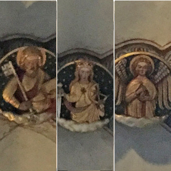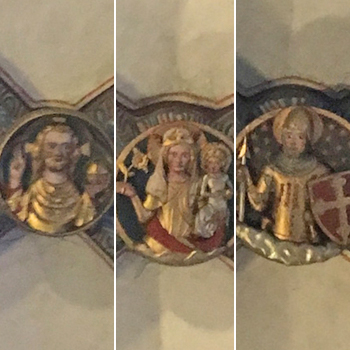 mehr anzeigenAls Schlussstein wird der Keilstein am höchsten Punkt eines Bogens, einer Kuppel oder eines Rippengewölbes bezeichnet. Erst durch den Schlussstein werden die Architekturglieder der Rippen zu einer selbsttragenden Konstruktion, was ihm eine besondere Bedeutung verleiht.Die Schlusssteine, die wir genauer betrachten möchten, befinden sich in den Seitenschiffen. Sie wurden in der 1. Hälfte des 15. Jahrhunderts hergestellt und stellen verschiedene Heilige dar. Jeder Schlussstein ist plastisch gearbeitet und durch die farbige Fassung des Gewölbes noch einmal gerahmt. Bei der farbigen Fassung der Schlusssteine wurde auch Gold zur Akzentuierung eingesetzt. In großer Höhe angebracht, trägt es zu einer dekorativen Gesamtwirkung bei, ohne als Material oder Gestalt in den Vordergrund zu treten.