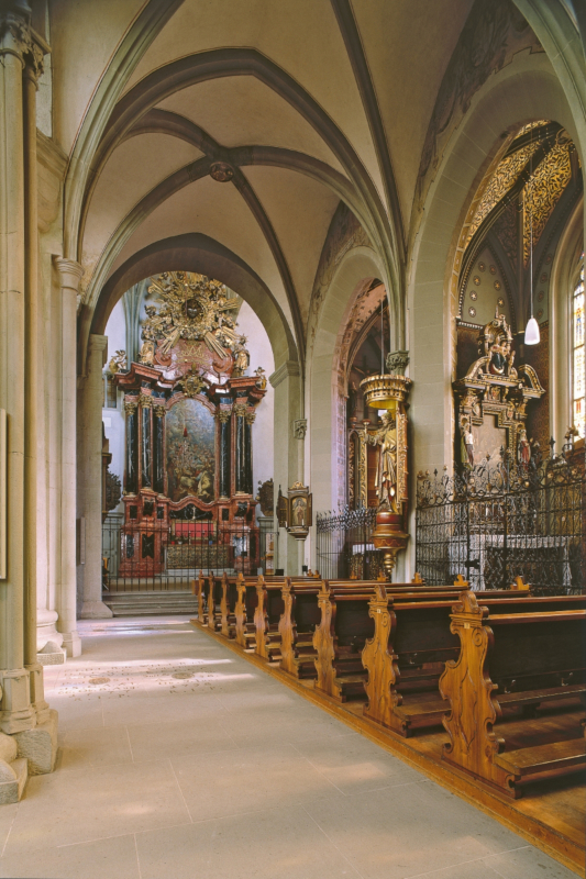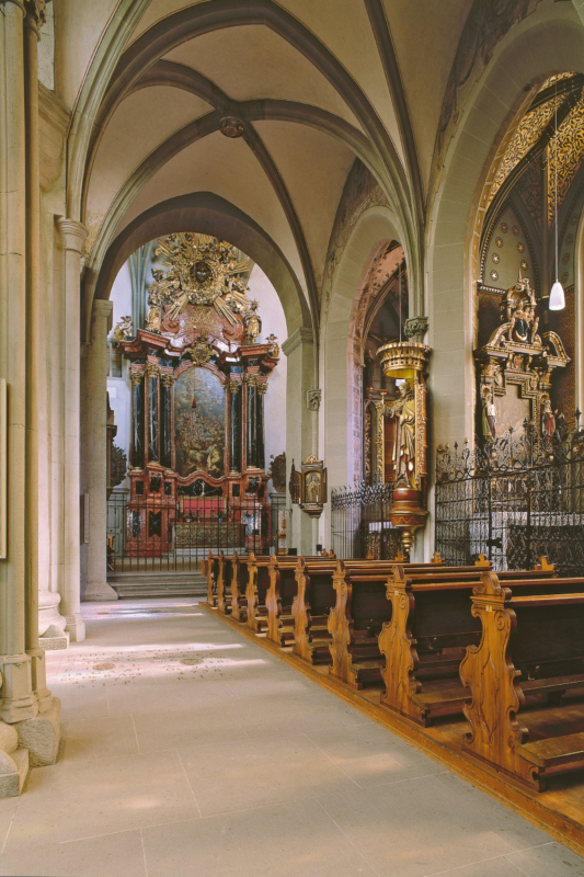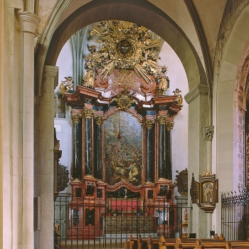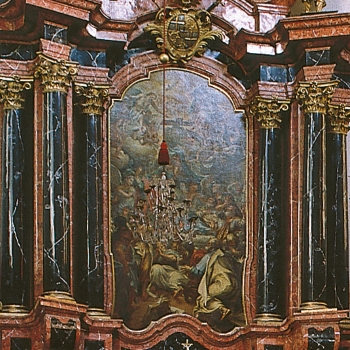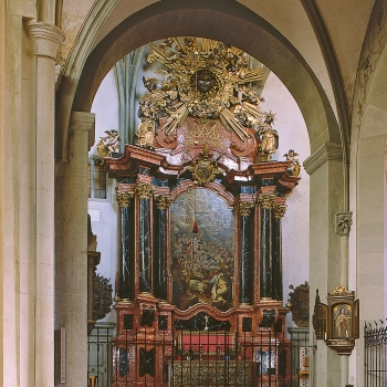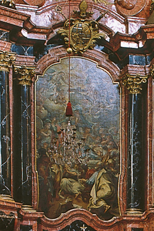 Johann Rieger: Altargemälde. 1710. Bischof Joh. Franz Vogt von Altensumerau und Prasberg (Auftraggeber): Altar, 1689. Roter und schwarzer Marmor; schwarze Säulengruppen mit vergoldeten Basen und Kapitellen, 12,30m hoch, 7,20m breit.