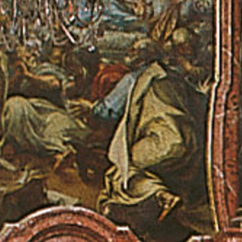 Hervorzuheben ist hier der Apostel Petrus, der sich am rechten unteren Bildrand befindet. Als Rückenfigur fungiert er als Betrachterstellvertreter, d.h. durch ihn wird dem Rezipienten der Einstieg in das Gemälde erleichtert, indem diesem die Position des Petrus angeboten wird. Die Figur des Apostels erhält damit eine Schlüsselfunktion im Bild. Wie treffend also, dass Petrus als erster Papst von Christus den Schlüssel zum Himmelreich erhielt und dieser auf dem Gemälde zu seinen Füßen liegt. (Mt.16,19)