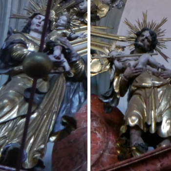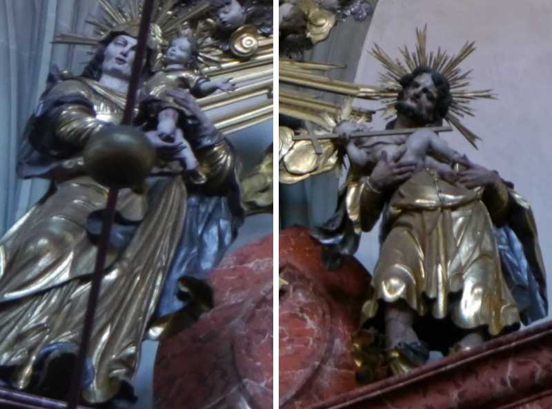 Links und Rechts der Gloriole stehen die Figuren Annas und Josephs, die aber erst 1771 zum Altar hinzugefügt wurden. Sie ergänzen die Ikonographie des Marientodes im Kreise der Apostel durch zwei wichtige Mitglieder der Familie Mariens. Anna, die Mutter Marias hält diese hier als Kind in den Armen. So wird im Figurenprogramm des Altars nicht nur der Marientod, sondern auch ihr Leben thematisiert. Joseph hingegen hält auf seinem Arm das Jesuskind. (Hermann 2013, S. 141)