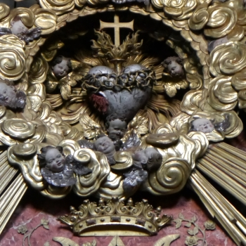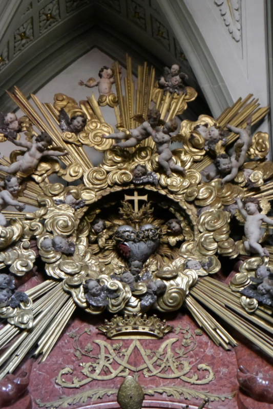 Über dem massiven Architrav der Altararchitektur befindet sich eine Gloriole aus vergoldetem Holz, die mit einigen Putti und einem Wolkenkranz geschmückt ist. In deren Mitte befindet sich ein Herz, das sowohl als Herz Christi als auch Mariens gedeutet werden kann, denn einerseits trägt es eine Dornenkrone und weist eine Wunde auf, die stark an die Seitenwunde Christi erinnert. Andererseits verweisen die Flammen am Herz auf das mitleidende Mutterherz der Maria.