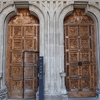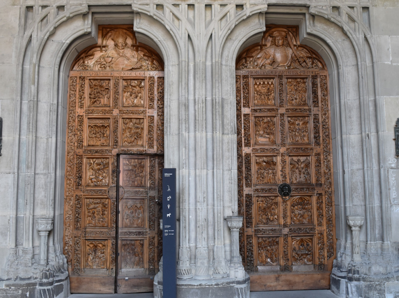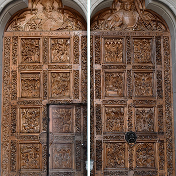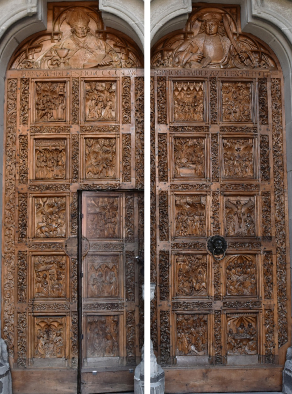 Werkstatt Simon Haider: Westportal des Konstanzer Münsters, ca. 1470. Nussbaumholz, jedes Portal 4,05m x 1,45m.