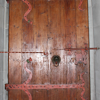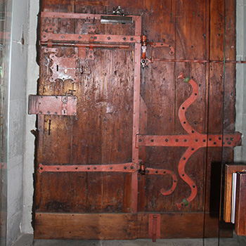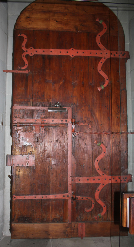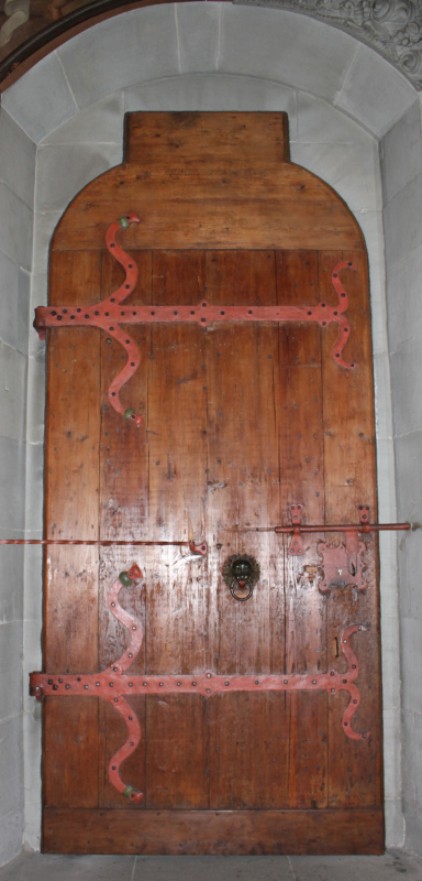 Im Jahr 1587 sind vermutlich die rechten unteren drei Reliefs der linken Portaltüre ausgeschnitten worden, um den Zugang in den Kirchenraum zu erleichtern (Reiners 1955, 370). Es entstand eine Tür in der Tür, die auch heute noch in Benutzung ist. Außen wird sie heute durch eine Glasplatte geschützt.