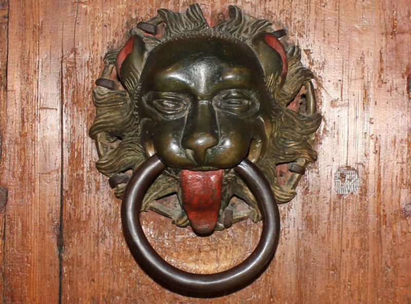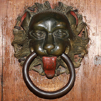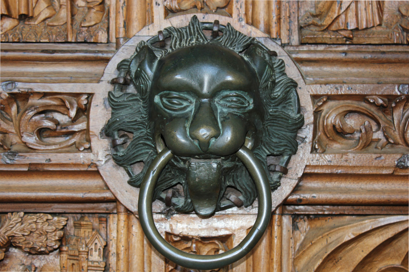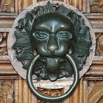 Aufgrund einer Ausgabenotiz aus dem Jahr 1506/07 können die bronzenen Türzieher dem Konstanzer Glocken-und Büchsengießer Nikolaus Oberacker zugeordnet werden (Reiners 1955, 370). Sie folgen einem seit der Antike bekannten und vor allem in der Romanik weit verbreiteten Typus: Löwenköpfe, die ein voluminöses Maul und eine stark gewölbte Stirn aufweisen. Die Portaltüren sind mit ausgesparten, runden Feldern zu deren Anbringung versehen, so waren sie vermutlich bereits 1470 vorgesehen, wurden jedoch erst 1506/07 gegossen (Hubert 2013, 262 ff.).