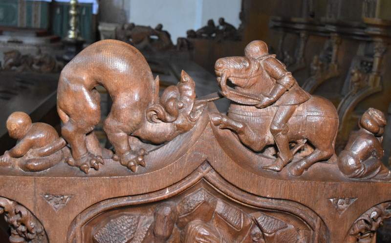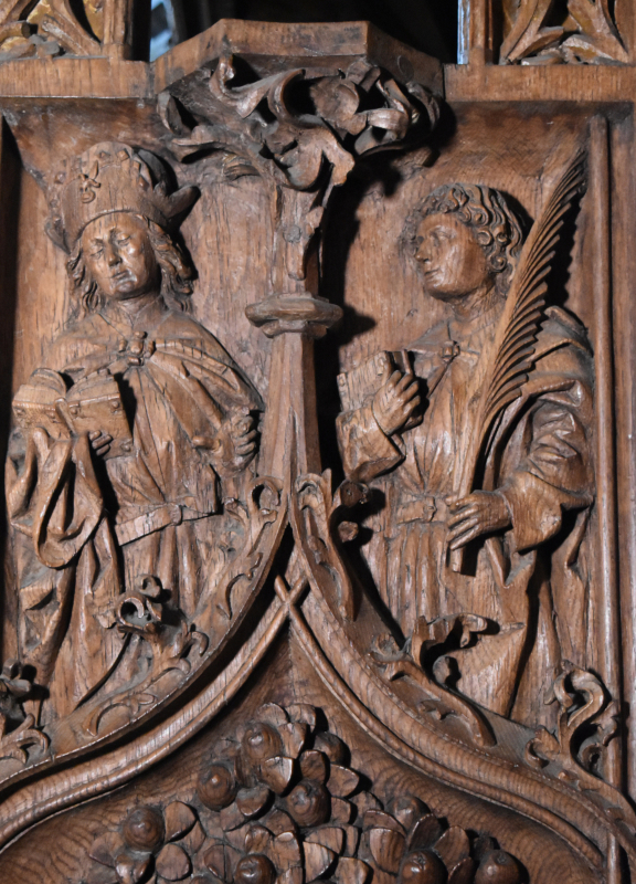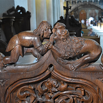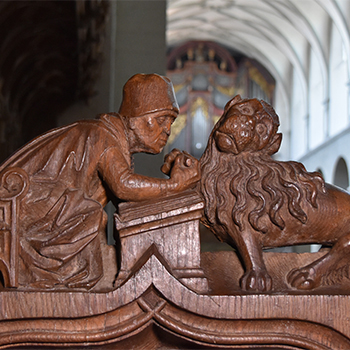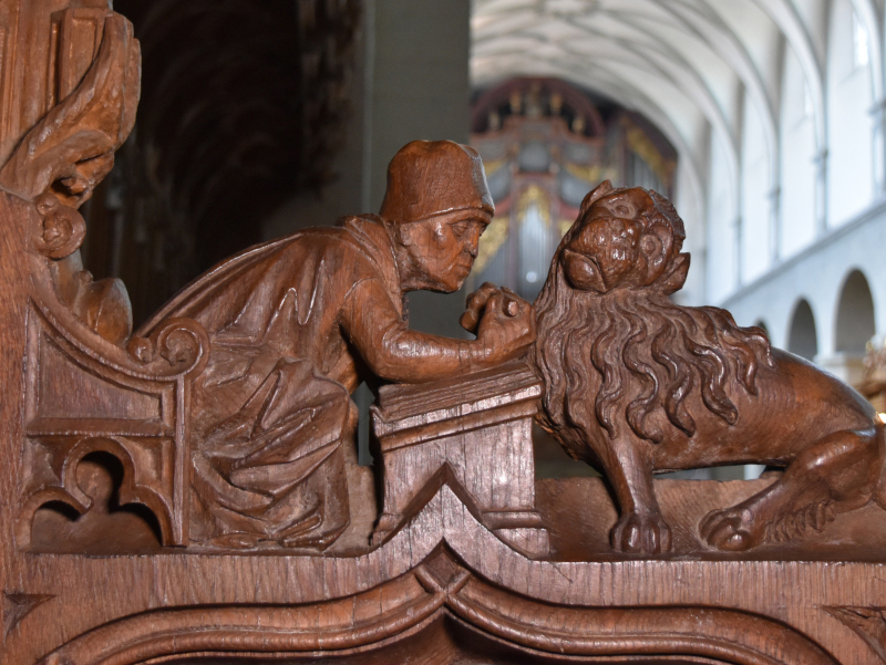 Die Wangenbekrönung zeigt den Hl. Hieronymus. Über ein Lesepult gebeugt, hält er die rechte Tatze eines Löwen, aus der er der Überlieferung nach einen Dorn zieht. Der Löwe lässt die Prozedur mit Schmerz verzogener Miene über sich ergehen. Dass alles so friedlich bleibt ist nur aus der gezeigten Perspektive zu erkennen. Erneut wird dazu animiert, den Betrachterstandpunkt zu wechseln.
