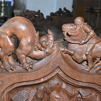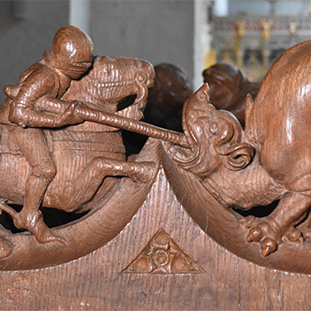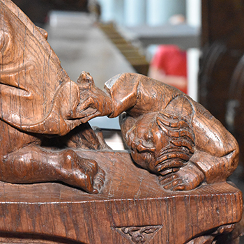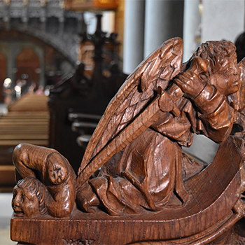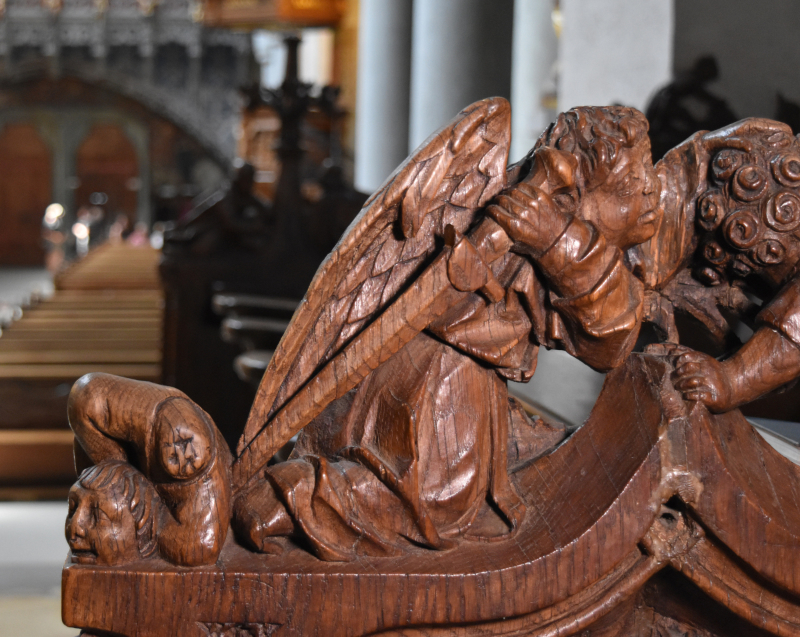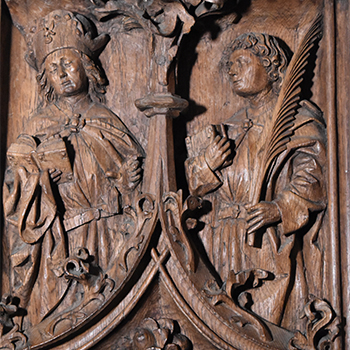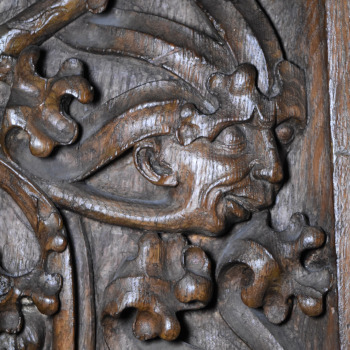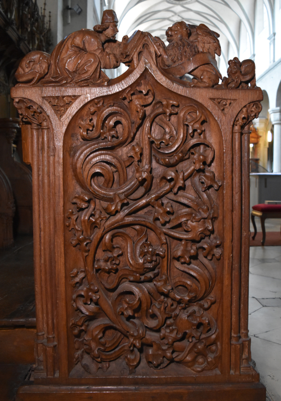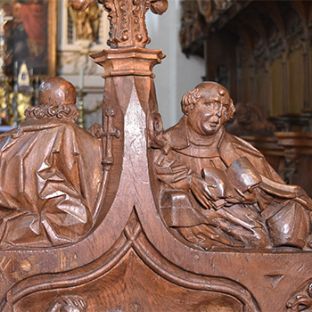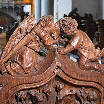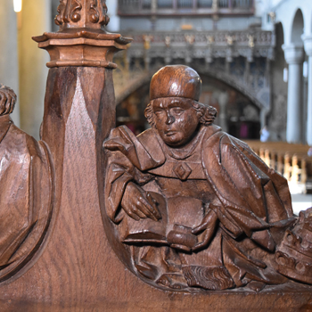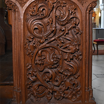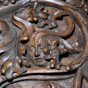 Die Gestühlswange zeigt ein feines Blattornament. Bei genauerer Betrachtung sind mehrere, mit dem Ornament verschlungene Gesichter auszumachen, deren Entdeckung jedoch eine intensive Auseinandersetzung mit der Darstellung erfordert. Wie viele Gesichter können Sie entdecken?