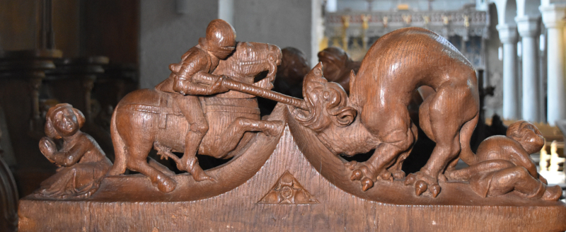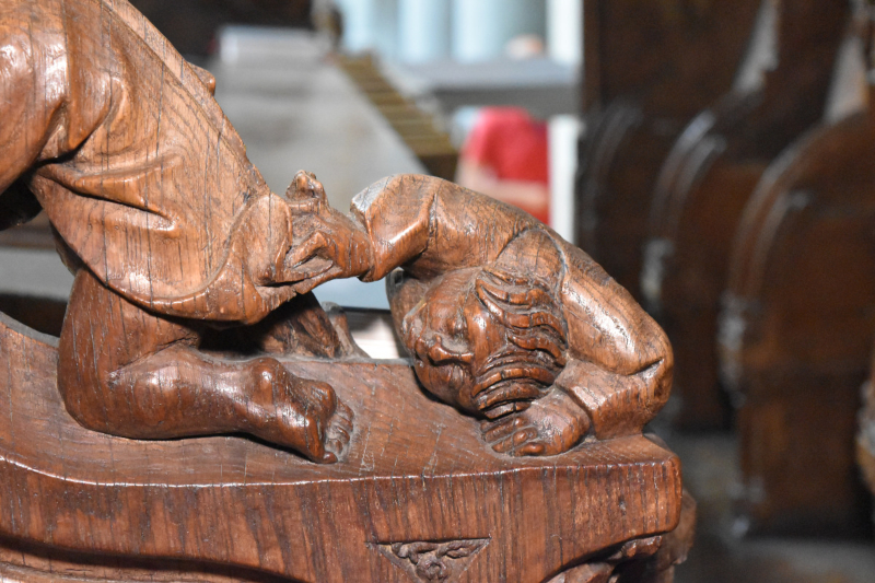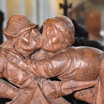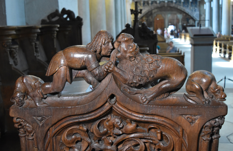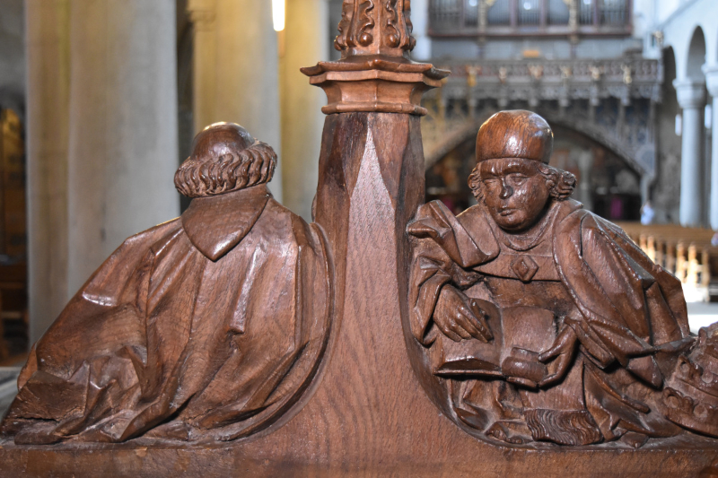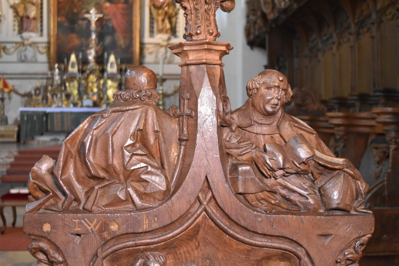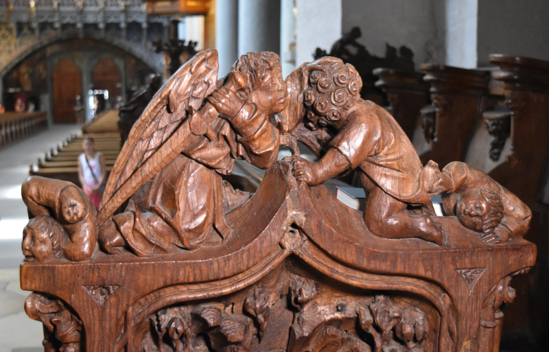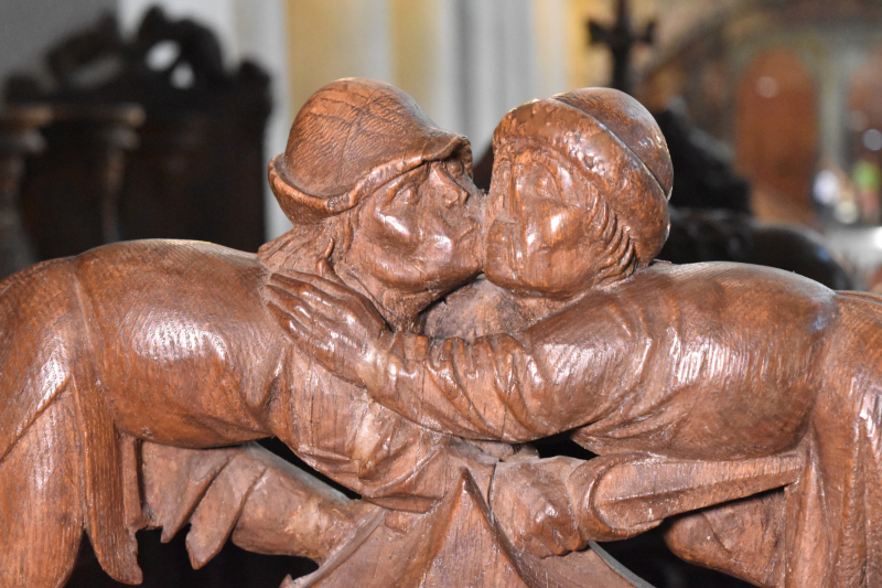 Nähert man sich dem Chorgestühl vom Mittelschiff aus, erwecken die beiden Figuren (möglicherweise Joab und Abner; Samuel II, 3,27) den Eindruck sich zu küssen. Erst beim Umgehen und dem damit verbundenen Perspektivwechsel eröffnet sich dem Betrachter die eigentliche Darstellung, die eines hinterlistigen Erdolchens.
