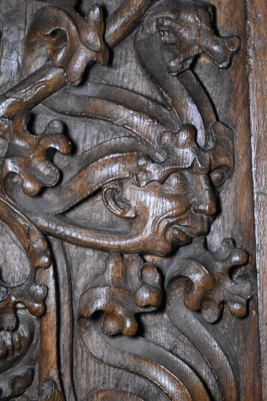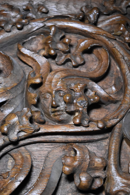 Kaum merklich hebt sich das geschnitzte Gesicht vom Blattornament ab.