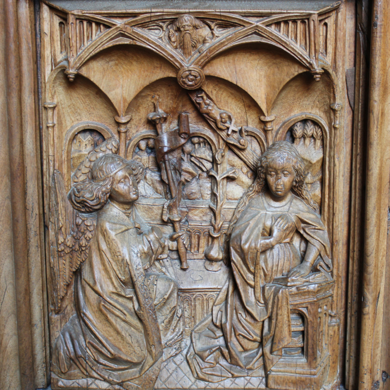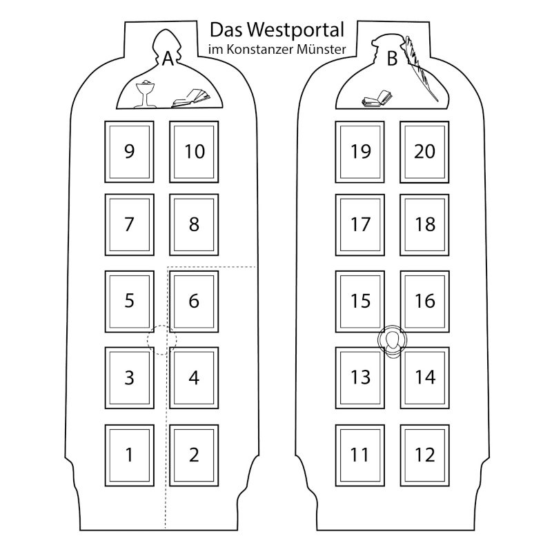 Werkstatt Simon Haider: Westportal des Konstanzer Münsters, ca. 1470. Nussbaumholz, jedes Portal 4,05m x 1,45m.
