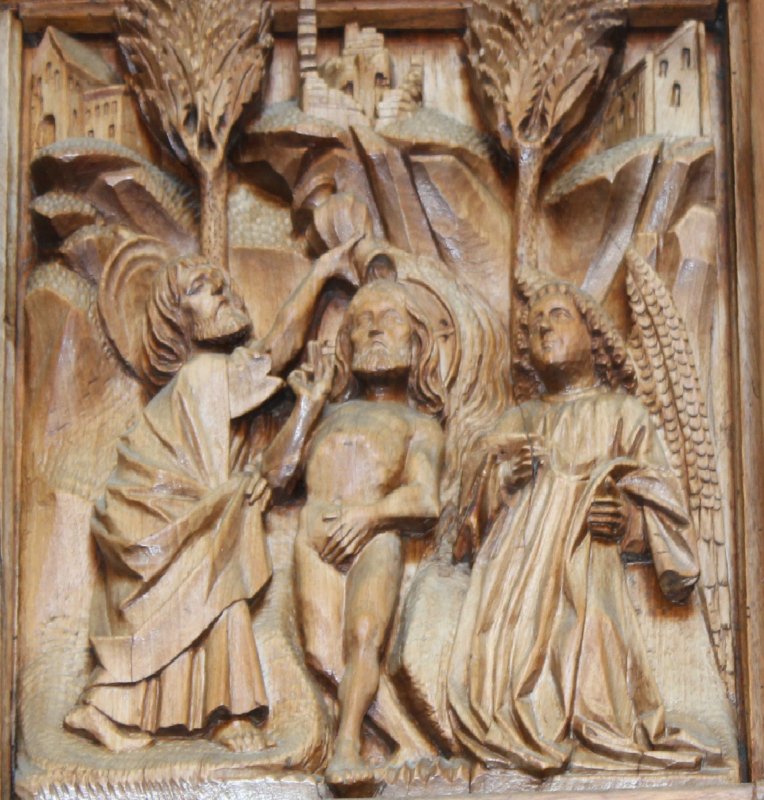 Johannes der Täufer tauft Jesus Christus im Beisein eines Engels im Fluss Jordan.