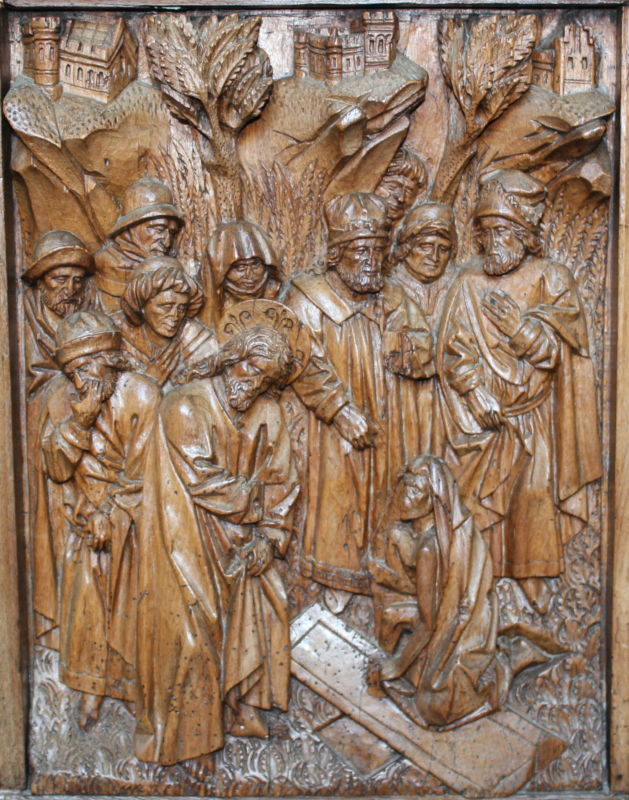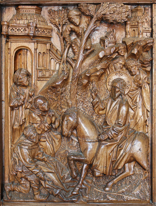 Jesus wird jubelnd in Jerusalem empfangen. Als Messias und Friedenskönig reitet er demütig auf einem Esel ein. Wie im Lukasevangelium (Lk 19, 28-48) beschrieben, breiten die Bewohner Jerusalems Kleider vor dem Dahinreitenden aus.