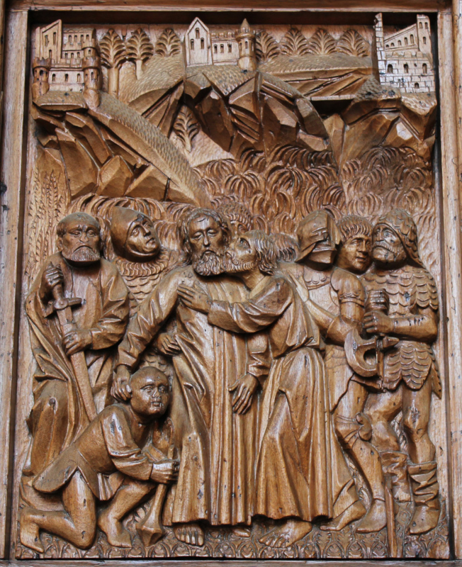 Jesus wird von einer Schar Bewaffneter, angeführt vom verräterischen Jünger Judas Iskariot, gefangen genommen und von diesem zum Zeichen geküsst. Dem Diener eines Hohepriesters wurde von Petrus das Ohr abgeschnitten, das jedoch von Jesus berührt und wieder geheilt wird.