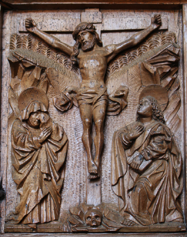 Der am Kreuz verstorbene Jesus Christus wird von seiner weinenden Mutter und dem Apostel Johannes betrauert.
