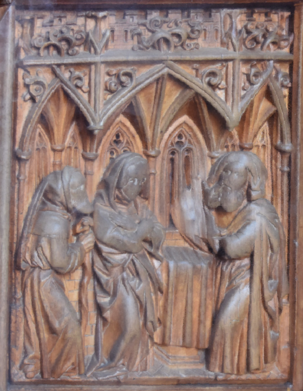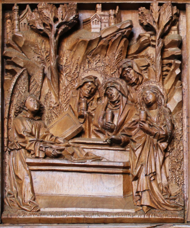 Um den Leichnam Christi zu salben, begeben sich die drei Marien (Maria Magdalena, Maria, Mutter des Jakobus und Maria Salome) zur Grabstätte. Dort angekommen, finden sie diese leer vor. Ein Engel verkündigt die Auferstehung Christi und präsentiert das leere Grabtuch. Die vierte Frauenfigur ohne Nimbus hinter den Marien ist bisher noch nicht gedeutet.