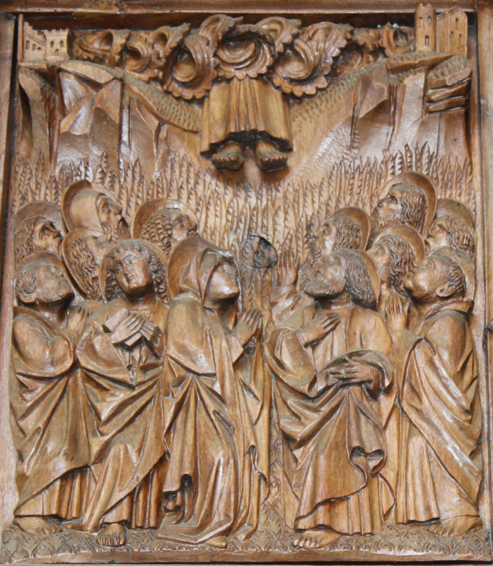 Über den Köpfen der Apostel und Mariens kehrt Christus als Sohn Gottes zu seinem Vater zurück und entschwindet in den Himmel.