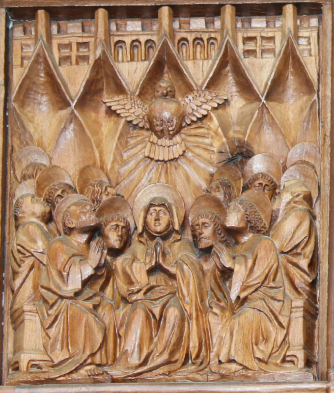 In Gestalt einer großen Taube erscheint der Heilige Geist über den Köpfen der demütig knienden Maria und der versammelten Apostelschar. Die von der Taube ausgehenden Lichtstrahlen stehen für den Geist, der die Apostel erfüllt und es ihnen ermöglicht, das Evangelium in allen Sprachen zu verkündigen.