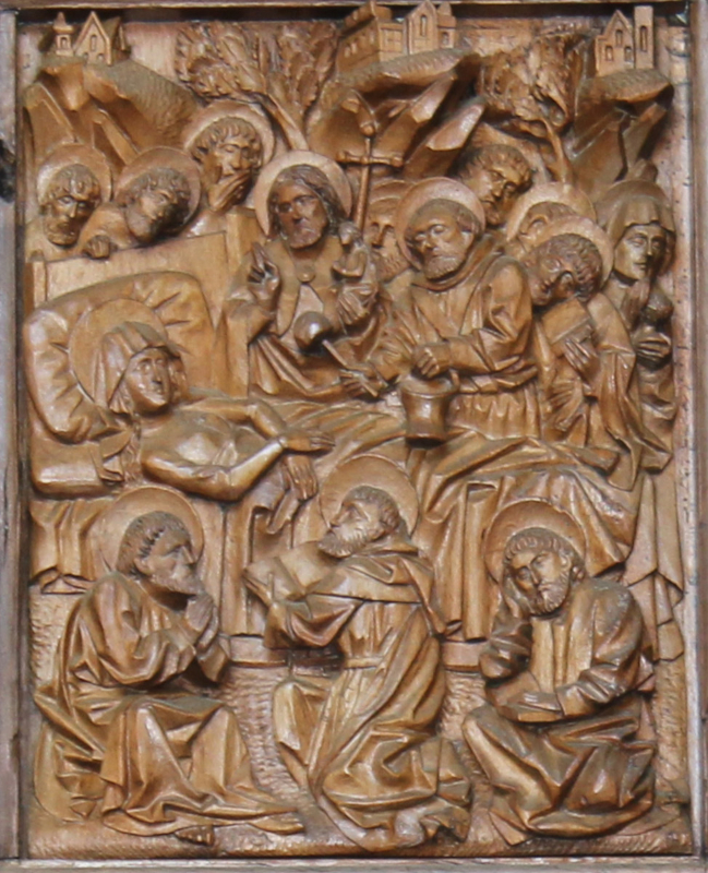 Die Apostel sind um Marias Sterbebett versammelt. Während Johannes mit Weihwasser die Exequien vollzieht, hält Christus mit Kreuz bereits die als Kind dargestellte Seele seiner Mutter auf dem Arm.