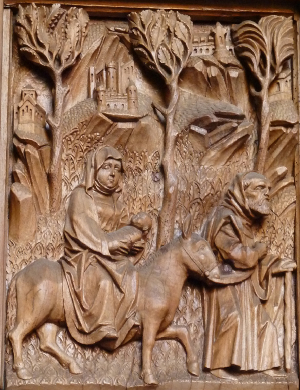 Josef, Maria und das Jesuskind fliehen nach Ägypten, um Herodes, der das Kind töten will, zu entkommen.
