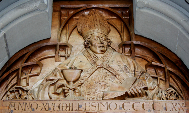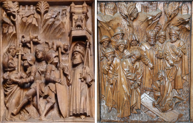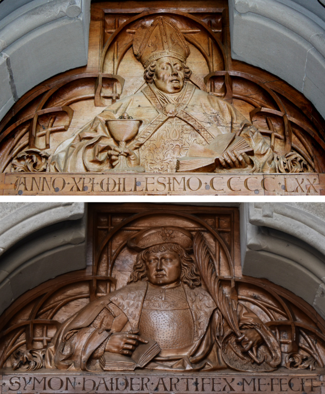 Werkstatt Simon Haider: Brustbilder des Hl. Konrad (oben) und des Hl. Pelagius (unten) am Westportal des Konstanzer Münsters, ca. 1470. Nussbaumholz, jedes Portal 4,05m x 1,45m.