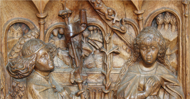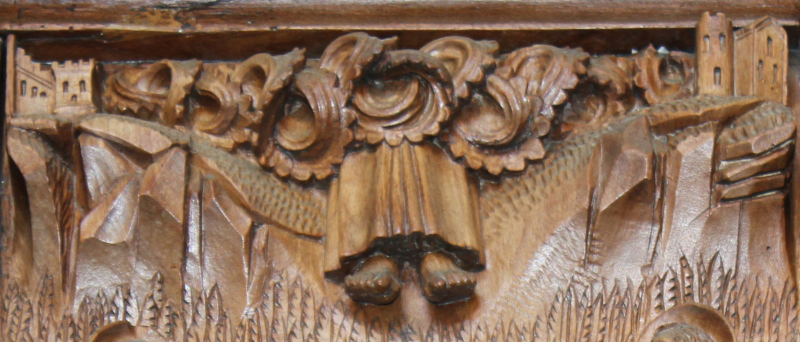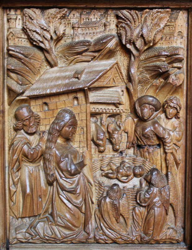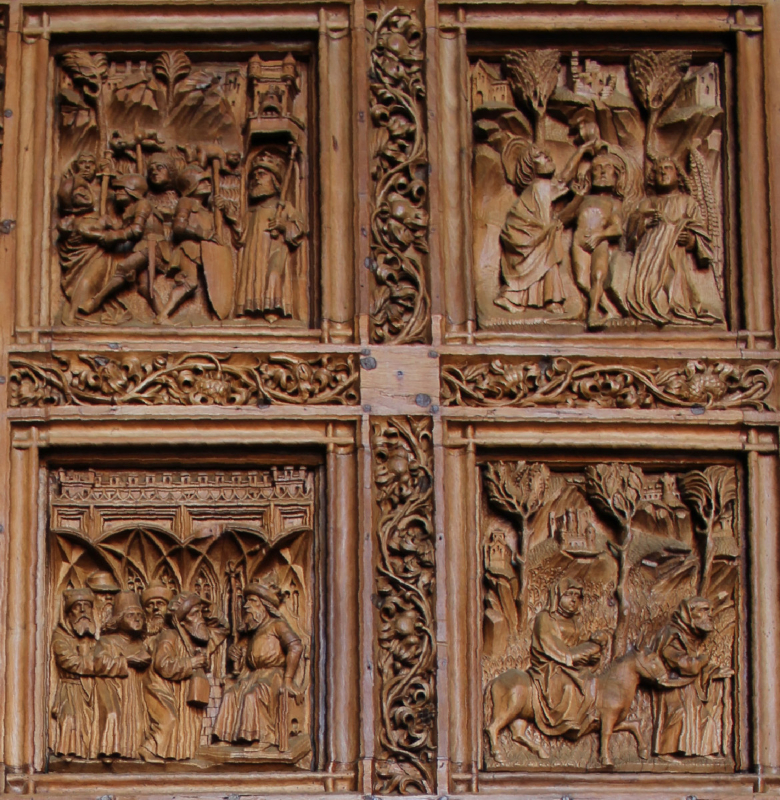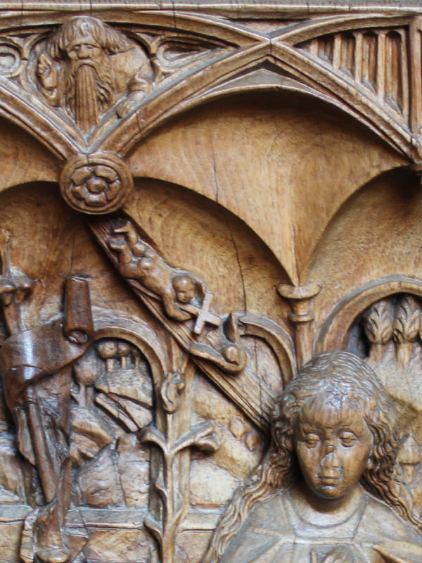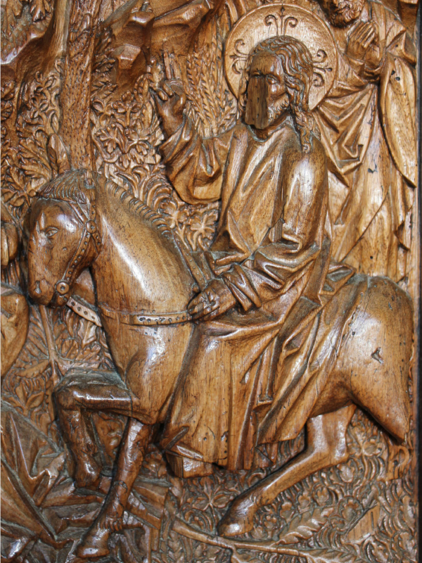 Der monumentale Bilderzyklus setzt sich aus mehreren Bibelszenen zusammen. In den meisten Reliefs entwickelt sich die Erzählung in Frontalsicht auf die dargestellten Personen, nur die Auferweckung des Lazarus, Magdalena salbt die Füße des Herrn, das letzte Abendmahl und der Marientod sind in starker perspektivischer Aufsicht wiedergegeben. Häufig stehen die Figuren, die etwas mehr als die ... mehr anzeigenDer monumentale Bilderzyklus setzt sich aus mehreren Bibelszenen zusammen. In den meisten Reliefs entwickelt sich die Erzählung in Frontalsicht auf die dargestellten Personen, nur die Auferweckung des Lazarus, Magdalena salbt die Füße des Herrn, das letzte Abendmahl und der Marientod sind in starker perspektivischer Aufsicht wiedergegeben. Häufig stehen die Figuren, die etwas mehr als die Hälfte der Höhe des Relieffeldes einnehmen, auf einer nach vorne hin abgeschrägten Bodenkante und befinden sich entweder vor einem fiktiven, raumvortäuschenden Landschaftshintergrund mit Architekturkulisse oder innerhalb einer Räumlichkeit (Hubert 2013, 262). Die Landschaft scheint jedoch ein zentrales Thema zu sein, wie vor allem am Beispiel des Marientodes zu beobachten ist. Das von den Aposteln umringte Sterbebett Marias befindet sich nicht, wie anzunehmen wäre, innerhalb einer Behausung, sondern inmitten einer Landschaft. Die auf Klippen thronende Stadtkulisse ist auch hier wieder allgegenwärtig.Die Szenen sind symmetrisch gegliedert, die Bäume dienen als tektonisch ordnendes Beiwerk (Reiners 1955, 370). Sie sind nicht im Flachrelief, sondern ebenso wie die Figuren und Landschafts-bzw. Architekturdetails plastisch im Halbrelief hervorgewölbt. Weitestgehend verweilen die Figuren innerhalb der Rahmung, nur partiell ragen Gewänder oder Gliedmaßen minimal über das Bildfeld hinaus. weniger anzeigen