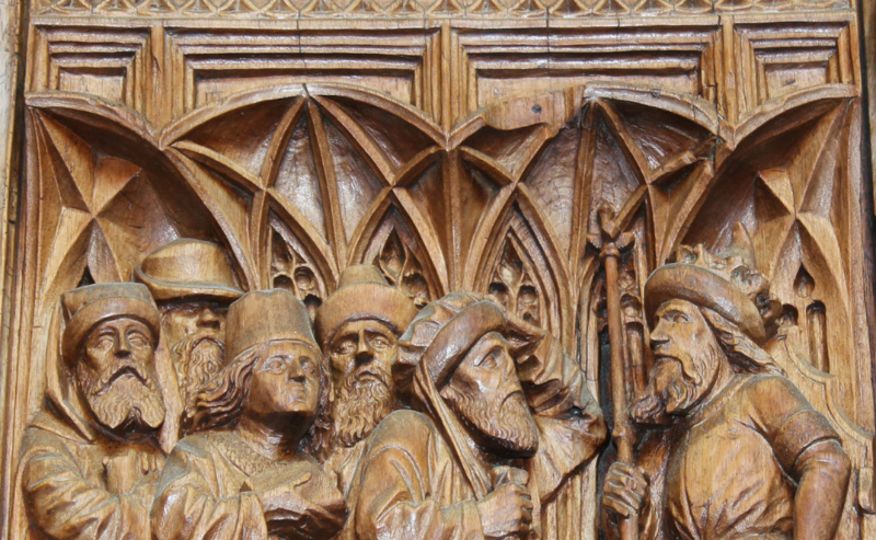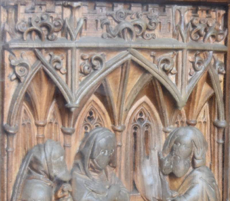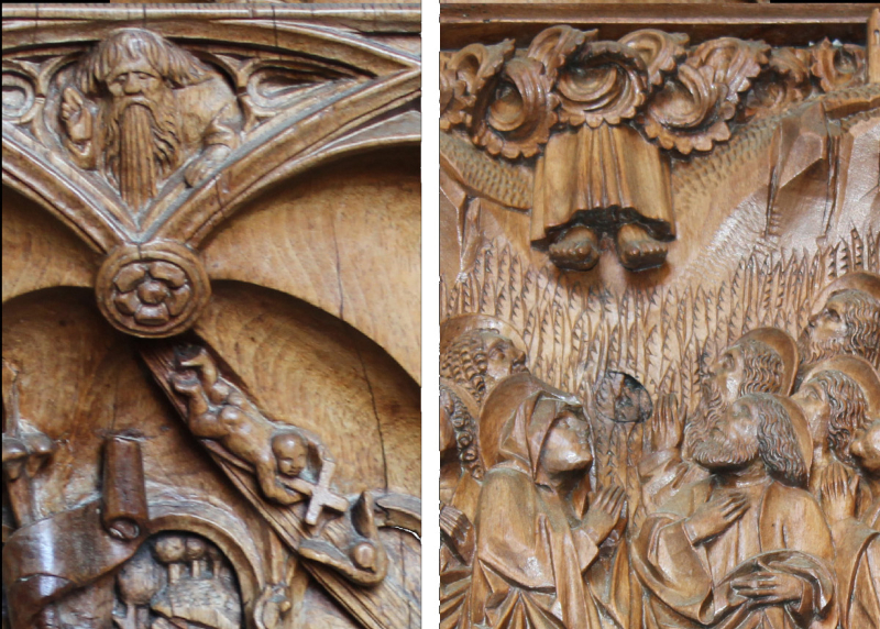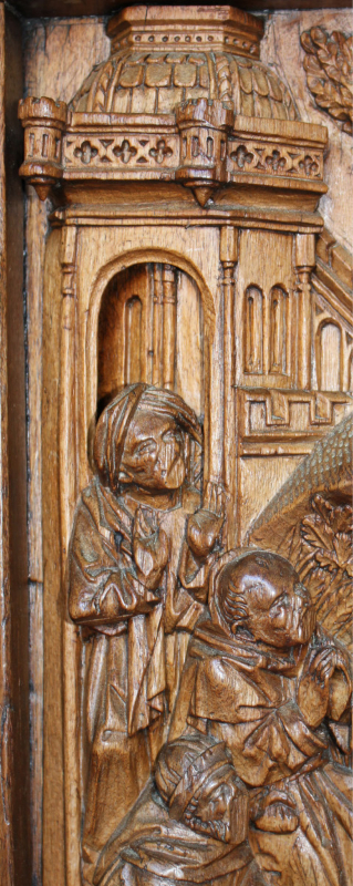 Neben den fein gearbeiteten Figuren ist auch bewundernswert geschnitzte Architektur in den Reliefbildern zu bestaunen. Durch sie wird nicht nur, wie im vorangegangenen Beispiel, auf das Portal und das „Hl. Grab“ verwiesen, sondern allgemein auf das Münster und seine Architektur. Das Kreuzrippengewölbe hatte Ende des 13. Jahrhunderts zunächst in der Miniaturarchitektur der Mauritiusrotunde, dann in den Kreuzgängen und im 15. Jahrhundert schließlich auch in den Seitenschiffen Einzug ins Münster gehalten.