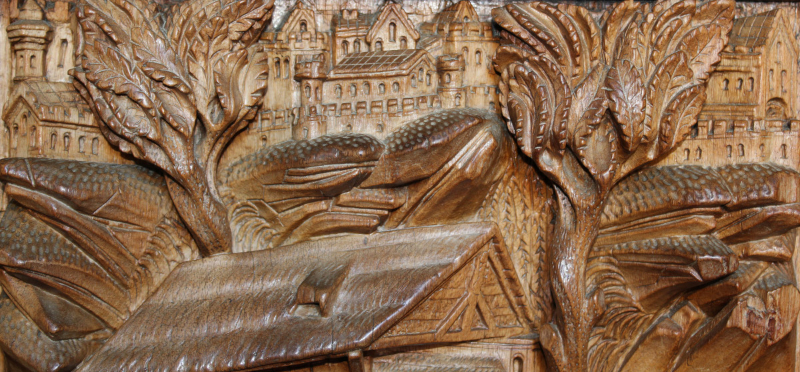 Die detailliert ausgearbeiteten, zeitgenössischen Stadtpanoramen verleihen den Reliefbildern eine illusorische Tiefenräumlichkeit und zeigen die große Kunstfertigkeit der Haiderschen Schnitzer auf. Sie wölben sich im Flachrelief hervor.