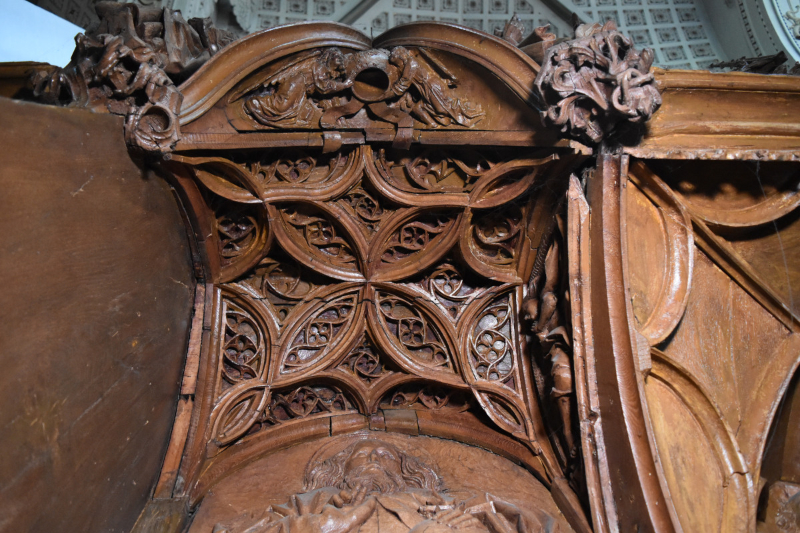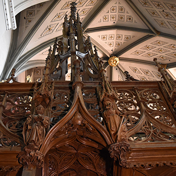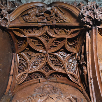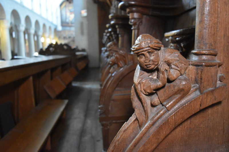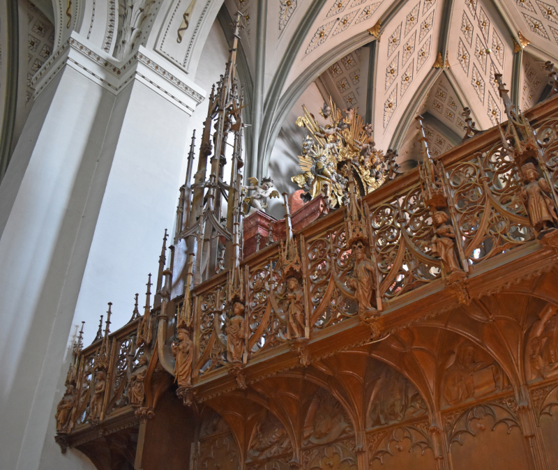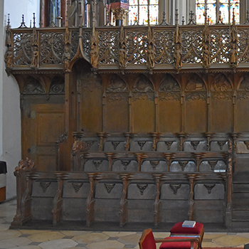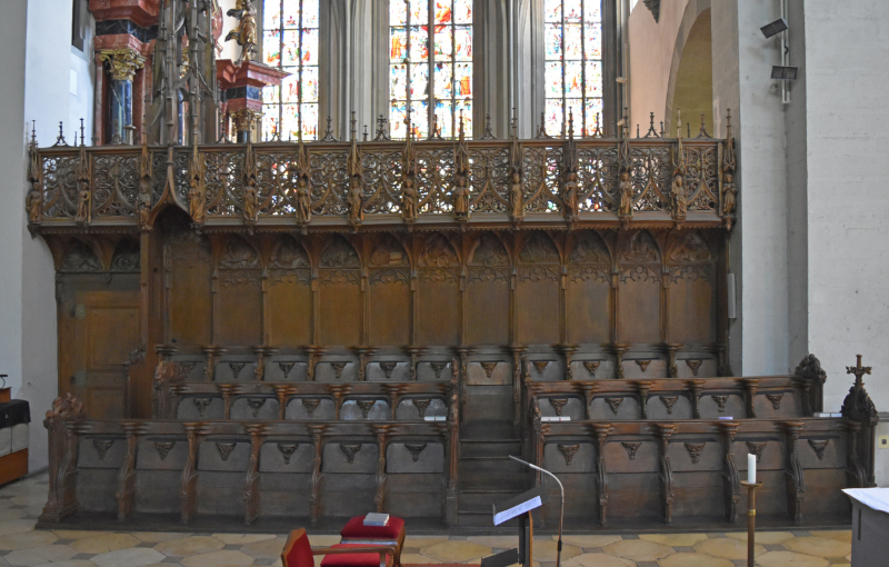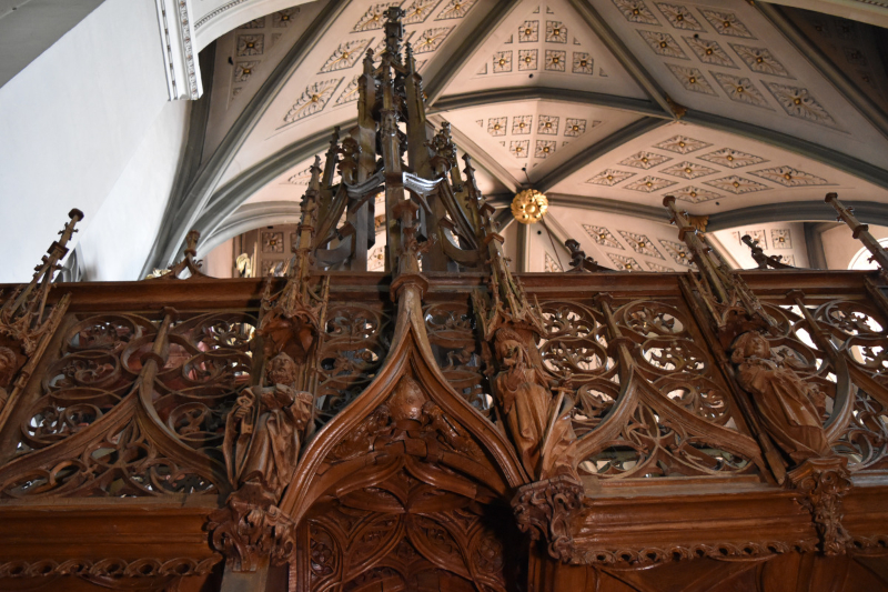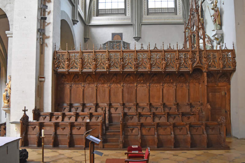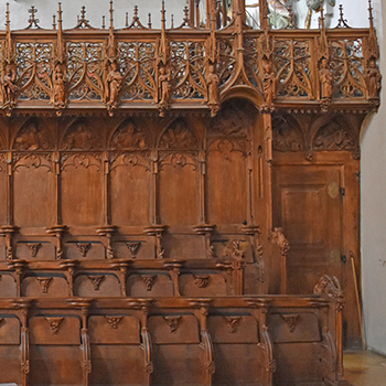 Werkstatt Simon Haider: Chorgestühl des Konstanzer Münsters, Eiche, ab 1467. Hier abgebildet ist die Evangelienseite.