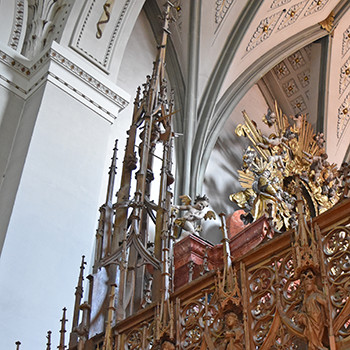 Der Sitz des Weihbischofs bzw. Domprobstes wird an der an den Marienchor angrenzenden Epistelseite (Südseite) durch einen schlanken, im gotischen Stil mit Krabben (Verzierungen in Gestalt eines Blatt-oder Knollenornaments) und Fialen (schlanke, spitz zulaufende Türmchen) geschmückten Turm hervorgehoben. In diesem ist Erzengel Michael mit einer Seelenwaage zu erblicken. An der Evangelienseite (Nordseite) hat das Türmchen keine figürliche Ausgestaltung erfahren. Unter der Balustrade zeigt der Fries, wie auch auf der Gegenseite, abwechselnd Apostel- und Prophetenbrustbilder.