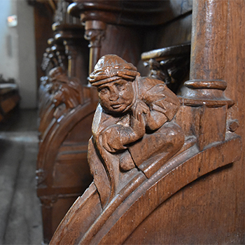 Nur in der obersten Reihe auf jeder Seite sind die Armstützen figürlich gestaltet. Es sind hockende Menschen- oder Tiergestalten, größtenteils jedoch männliche Figuren mit Büchern oder Schriftbändern zu sehen. An den übrigen Trennungswänden sind Knäufe als Armstützen für die Sitzenden angebracht (Reiners 1955, 358).