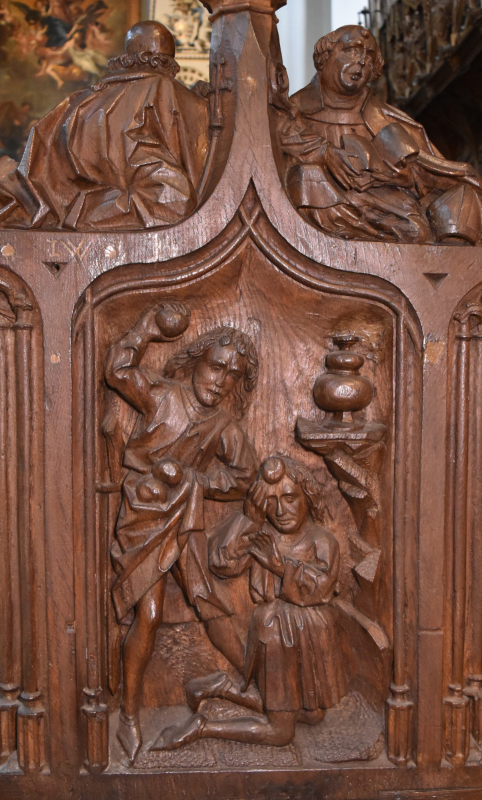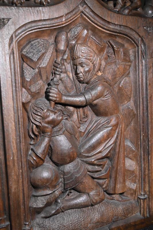 Um das umfangreiche Bildprogramm des Chorgestühls zu fertigen, bedienten sich die Bildschnitzer verschiedenster spitzer Werkzeuge und bildhauerischer Techniken. Mit Kraft und Geschick, durch Sägen, Hobeln und Schnitzen wurde auf das hölzerne Material eingewirkt. Einige der auf den Gestühlwangen abgebildeten Szenen können als (indirekte) Referenz und grobe Umkehrung dieser Tätigkeit gesehen werden. Diese Westwange zeigt zum Beispiel Jahel, die dem vor ihr knienden und schlafenden Ritter Sisara mit einem Holzhammer einen Keil ins Auge treibt.