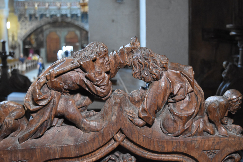Weitere Zusammenhänge sind an der Westwange des unteren Durchgangs der südlichen Chorseite zu entdecken. Die Bekrönung der Wange zeigt den Brudermord. Erneut wird ausgeholt, in diesem Fall sogar mit einem Werkzeug, der Axt.