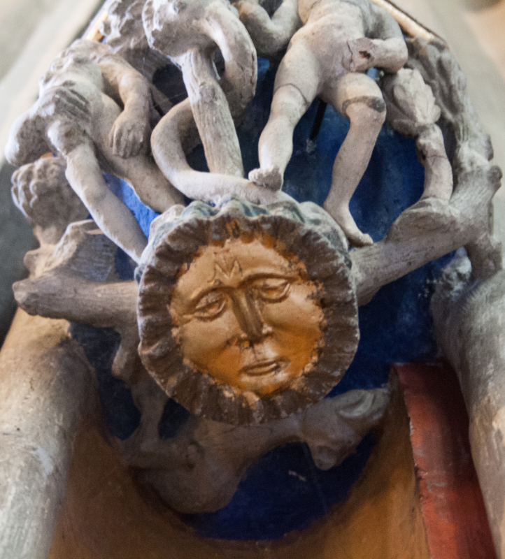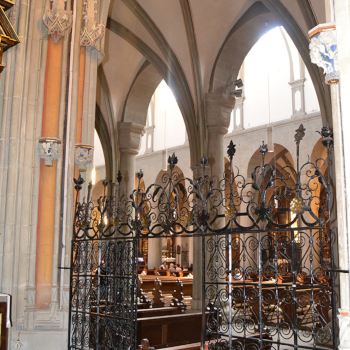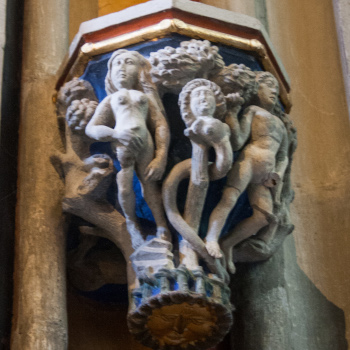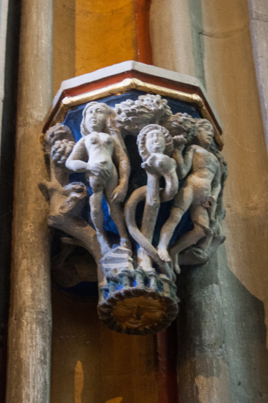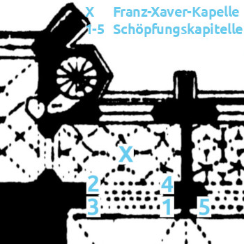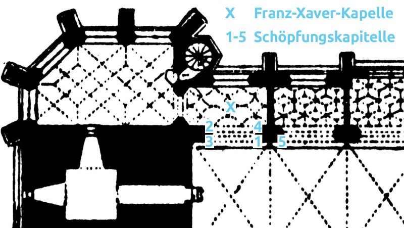 Die Franz-Xaver-Kapelle wurde in den 1480er Jahren mit der sich anschließenden Welserkapelle als Begräbnisstätte von Bischof Otto von Sonnenberg angelegt. Der Zutritt erfolgt über eine spitzbogige Arkadenöffnung, an deren Pfeiler figürlich ausgearbeitete Konsolen mit gotischen Baldachinen angebracht sind. Wie die übrigen Nordkapellen durchlebte auch diese eine sehr bewegte Bau- und ... mehr anzeigenDie Franz-Xaver-Kapelle wurde in den 1480er Jahren mit der sich anschließenden Welserkapelle als Begräbnisstätte von Bischof Otto von Sonnenberg angelegt. Der Zutritt erfolgt über eine spitzbogige Arkadenöffnung, an deren Pfeiler figürlich ausgearbeitete Konsolen mit gotischen Baldachinen angebracht sind. Wie die übrigen Nordkapellen durchlebte auch diese eine sehr bewegte Bau- und Ausstattungsgeschichte, wobei den Bilderstürmen der Reformationsjahre von 1526-51 einige Objekte, darunter auch die ursprünglich auf den Konsolen befindlichen Skulpturen, zum Opfer fielen. Im Barock wurde die Kapelle von derjenigen des Hl. Bartholomäus durch eine Scheidwand getrennt, wodurch einige Konsolen zerstört wurden. (Borrmann 2002, 60 und GRÖBER 1948, 133) Heute sind diese fünf die einzigen erhaltenen ihrer Art an den Eingängen zu den Seitenkapellen des Münsters.Marginale bauplastische Formen wie die genannten Figurenkonsolen zählen zu den charakteristischen, wenngleich zumeist unbeachteten Merkmalen mittelalterlicher Architektur. Häufig besetzen sie mit ‚randständigen‘, nämlich ungewöhnlichen vegetabilen, geometrischen, tierischen oder menschlichen Motiven unterprivilegierte, dezentrale Schwellenräume des Kirchengebäudes. Das Zentrum hingegen bleibt traditionell dem Allerheiligsten und damit den ‚großen Themen‘ der Heilsgeschichte vorbehalten. (DINZELBACHER 2014, 8ff. und 27). Nachfolgend gilt es, das spielerische Rezeptionsprinzip der Schöpfungskonsolen zu entschlüsseln, das nicht nur die Inhalte einzelner Bibelszenen erzählt, sondern dessen spezifische Raumkonstellation einen übergeordneten Erzählmehrwert bedingt. weniger anzeigen