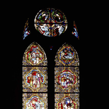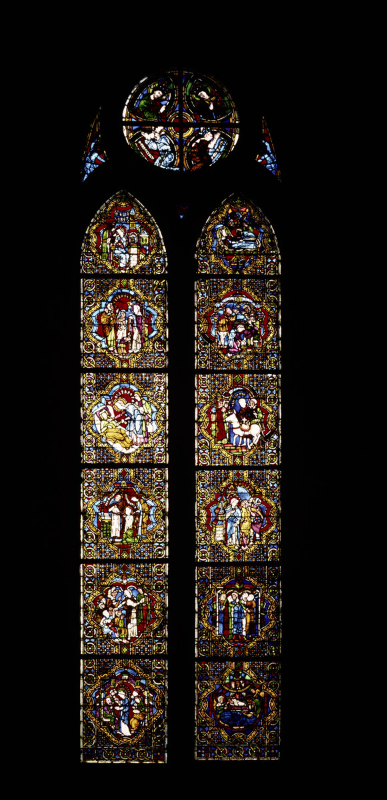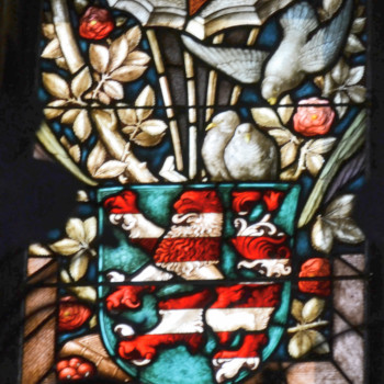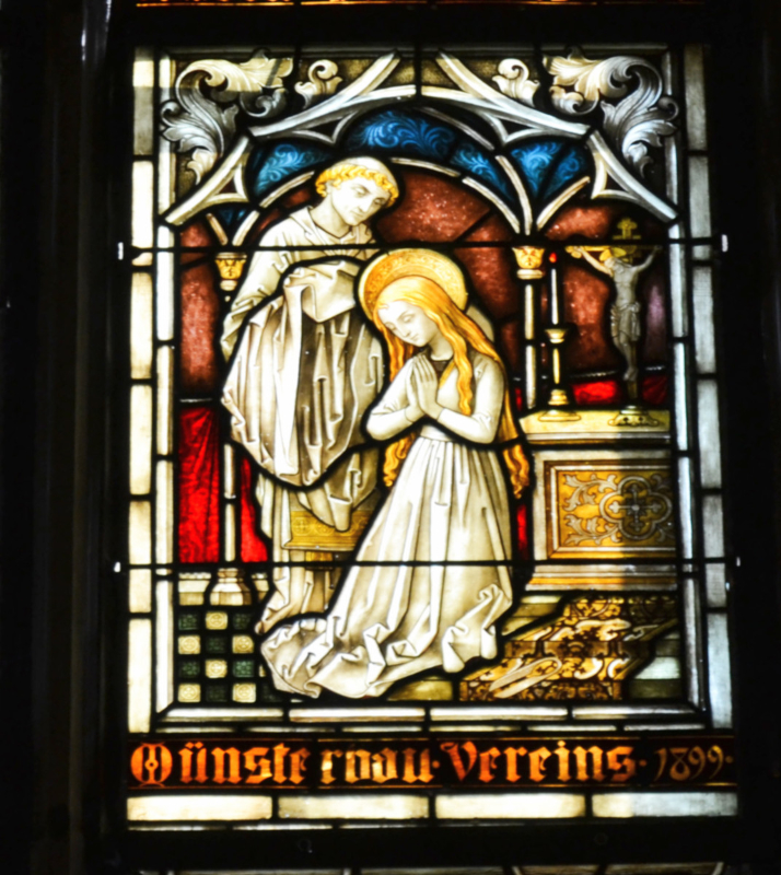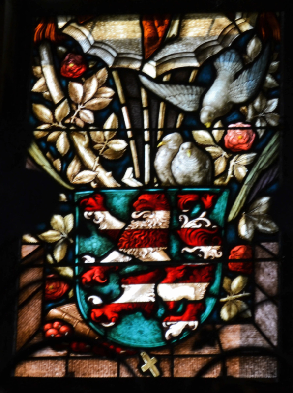 Einen ersten Eindruck vermitteln folgende Beispiele: Geiges verwendete bei der Imitation gotischer Maßwerkabschlüsse kein traditionelles Formenvokabular, sondern ein symbolisches, ornamentales Rosenmuster und von Lichtflammen durchsetzte Kronen. Auch enthalten die zahlreichen Schriftzüge, die in gotisierender Schrift verfasst sind, sowohl lateinische als auch deutsche Sentenzen – letzteres wäre aber in der Gotik undenkbar. weniger anzeigen
