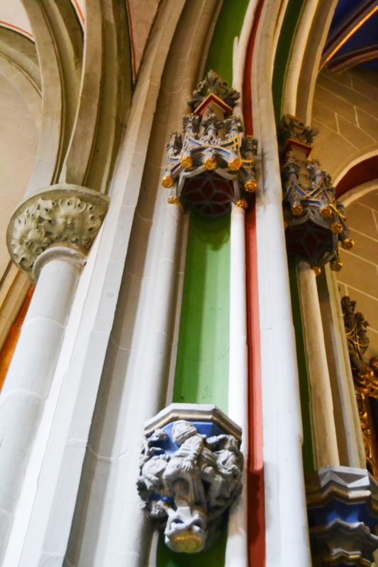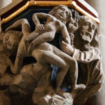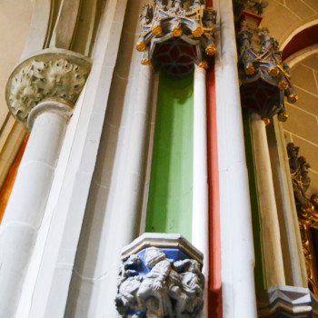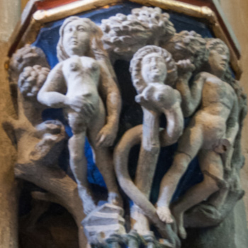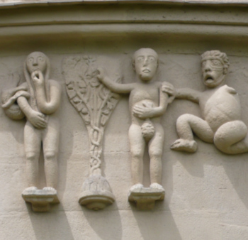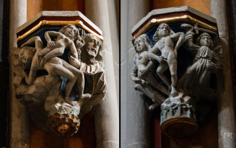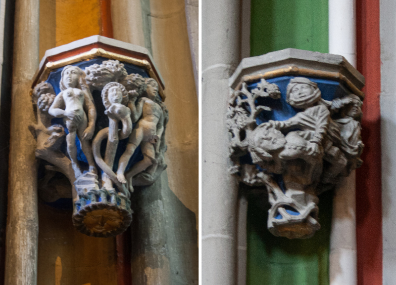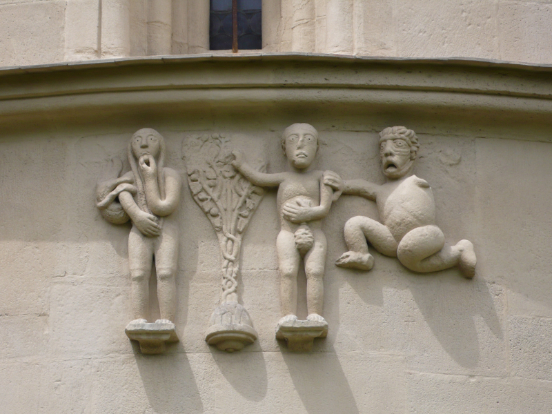 Der erste Durchgang hat verdeutlicht, wie die einzelnen Konsolenplastiken sowohl miteinander in ihrer räumlichen Verortung als auch mit dem Betrachter in seiner räumlichen Bewegung interagieren: Beide horizontalen Faktoren bedingen wesentlich die Funktionsweise dieser übergreifenden Bild-Raum-Erzählung. Der zweite Schritt soll sich der vertikalen Logik zuwenden, der dieser Konsolenschmuck ... mehr anzeigenDer erste Durchgang hat verdeutlicht, wie die einzelnen Konsolenplastiken sowohl miteinander in ihrer räumlichen Verortung als auch mit dem Betrachter in seiner räumlichen Bewegung interagieren: Beide horizontalen Faktoren bedingen wesentlich die Funktionsweise dieser übergreifenden Bild-Raum-Erzählung. Der zweite Schritt soll sich der vertikalen Logik zuwenden, der dieser Konsolenschmuck unterstellt ist.Die Motive marginaler Bauplastik können unheimlich-befremdlich, humorvoll-skurril oder auch derb-erotisch ausfallen. Es scheint darum zu gehen, den Betrachter emotional zu affizieren, ihn zu erschrecken, zu bedrohen, zum Lachen zu bringen, nachdenklich zu stimmen und dergleichen mehr (Dinzelbacher 2014, 8ff., 50, 54). Insgesamt verfolgt marginale Bauplastik damit eine „Psychologie der Faszination“ (Dinzelbacher 2014, 54), indem das Fremde, Degenerierte, Bedrohliche, moralisch Verwerfliche oder nur schwer Kategorisierbare dem Betrachter auf irritierende Weise ‚zu nahe tritt‘, während die moralisch-überlegenen, positiven Heiligenfiguren in entrückter Ferne bewundert, verehrt und angebetet werden sollen (Dinzelbacher 2014, 55f.). Über einen Vergleich mit thematisch verwandten marginalen Bauplastiken der Romanik und Gotik wollen wir nun einige Spezifika der Stilistik und Kompositionsweise der Konstanzer Figurenkonsolen umreißen, die in den einzelnen Bilderzählungen in besonderer Weise an die Schaulust des Betrachters appellieren. weniger anzeigen