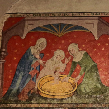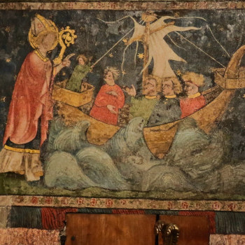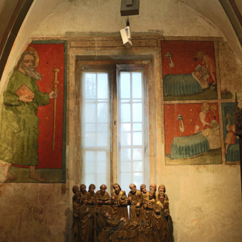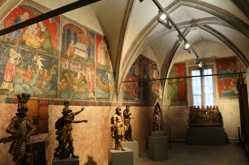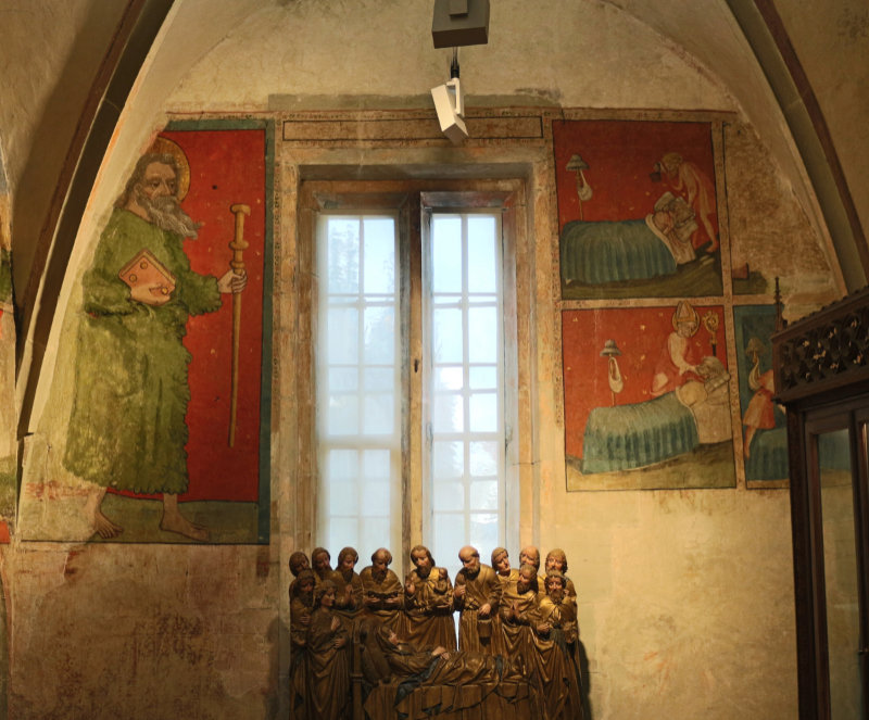Die heutige Schatzkammer ist im Anschluss an die obere Sakristei in der gotischen Bauphase des frühen 14. Jh. entstanden und nimmt den westlichen Teil des oberen Kreuzganggeschosses ein (Konrad 2013, 136). Neben einigen Objekten des Münsterschatzes, welche die Unbilden der Zeiten überdauern konnten, beherbergt die rechteckige Kapelle an der Südwand ein weiteres Kleinod in Gestalt von ... mehr anzeigenDie heutige Schatzkammer ist im Anschluss an die obere Sakristei in der gotischen Bauphase des frühen 14. Jh. entstanden und nimmt den westlichen Teil des oberen Kreuzganggeschosses ein (Konrad 2013, 136). Neben einigen Objekten des Münsterschatzes, welche die Unbilden der Zeiten überdauern konnten, beherbergt die rechteckige Kapelle an der Südwand ein weiteres Kleinod in Gestalt von Wandmalereien.Die Ausmalung mit dem Nikolaus-Zyklus erfolgte nicht direkt im Zuge der Erbauung der Kapelle. Stilistische Datierungen der Forschung bewegen sich zwischen 1410 und 1431 (Konrad 2013, 136; Reiners 1955, S. 259f.), wobei Conrad Gröber z.B. einen Zusammenhang mit der Gründung der Konstanzer Nikolausbruderschaft am 24. März 1431 vermutete (Gröber 1948, 189f.). Auch eine Zuschreibung an einen Künstler ist nicht eindeutig möglich, es werden diverse Konstanzer Maler der Zeit sowie Wandermaler in Betracht gezogen (Konrad 2013, 138).