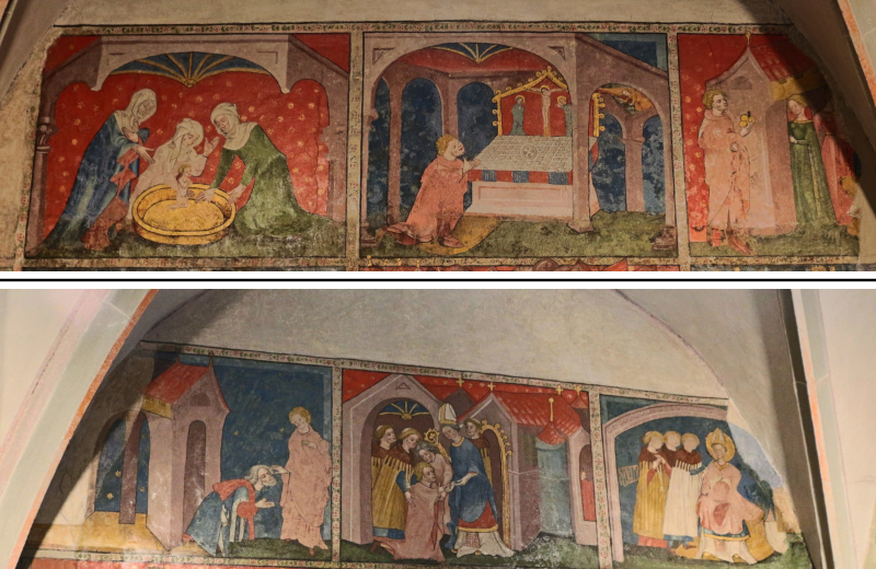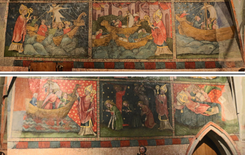 Der Hauptzyklus fasst in zwei Registern insgesamt zwölf Szenen aus dem Leben des hl. Nikolaus von Myra (270-342 n. Chr.). Die Bilderreihe erzählt über einen multiszenischen, aber „distinguierenden Erzählstil“ (Wickhoff 1895, 13-20 u.a.; Rehm 2004, 163f.; Kemp 2011, 63; Karpf 1994, 13ff.), indem mehrere Episoden der Heiligenbiographie im chronologischen Nebeneinander der Bildfelder über zwei Register in Leserichtung dargestellt werden. Dabei wird der Protagonist Nikolaus in jedem Bildfeld abgebildet. Der Fokus der Darstellung liegt auf der Nothelferfunktion des Heiligen, der Patron u.a. der Schiffer, Fischer, Kinder, Gefangenen und ‚heiratslustigen‘ Mädchen ist (Petzoldt 2015, 51). Eingebunden sind die Szenen in ein Rahmensystem, an dessen Unterkante eine gemalte Fransenborte den Eindruck erweckt, es handele sich bei dem gemalten Zyklus um einen Wandteppich (Konrad 2013, 136).
