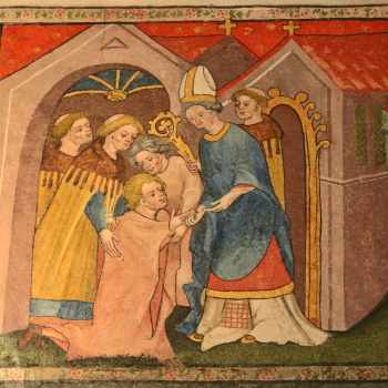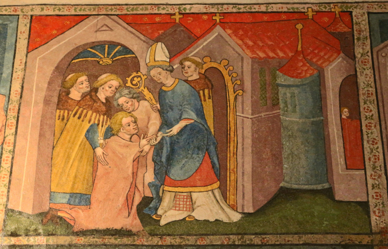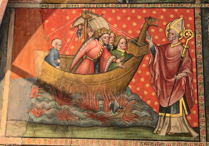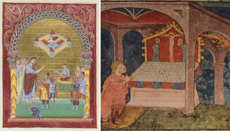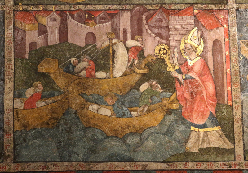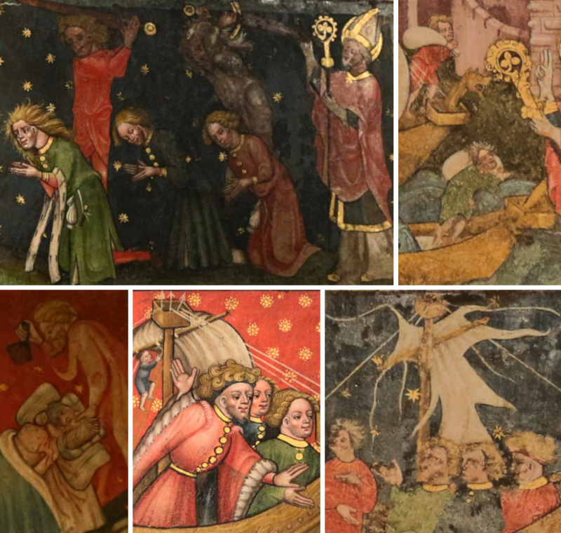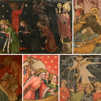 G. E. Lessing hat den wohl charakteristischsten Wesenszug der Malerei benannt: Sie ist notwendigerweise eine Raumkunst ohne zeitliche Ausdehnung (Lessing 1766, 113f.; Karpf 1994, 11). Ihr erzählerisches Potential ist damit klar umrissen: Es kann zum einen über die Sukzession von Bildfeldern und bzw. oder bildimmanent, d.h. innerhalb eines einzelnen Bildfeldes, erzählt werden, indem dort ... mehr anzeigenG. E. Lessing hat den wohl charakteristischsten Wesenszug der Malerei benannt: Sie ist notwendigerweise eine Raumkunst ohne zeitliche Ausdehnung (Lessing 1766, 113f.; Karpf 1994, 11). Ihr erzählerisches Potential ist damit klar umrissen: Es kann zum einen über die Sukzession von Bildfeldern und bzw. oder bildimmanent, d.h. innerhalb eines einzelnen Bildfeldes, erzählt werden, indem dort Räume für die Bilderzählung eingerichtet werden. Wolfgang Kemp hat in diesem Zusammenhang einen wesentlichen Umbruch in den visuellen Erzählstrategien um 1300 erkannt (Kemp 1996, 9-14). Im frühen Mittelalter fungierten architektonische oder landschaftliche Räume zumeist als ornamental verkürzte Chiffren, als kennzeichnende ‚Ortsangaben‘ ohne Einfluss auf die Narration wie am Beispiel der vermeintlich ‚schwebenden‘ Stadt Naim in der abgebildeten Erweckung eines Jünglings zu erkennen ist. Ab 1300 wurden ausgehend von Italien Räume immer häufiger eingerichtet, um komplexere, bildimmanente Erzählungen zu ermöglichen. Im Typus des ‚Puppenhauses‘, das die Außenwände für die Blicke des Betrachters transparent werden lässt, wurden erstmals Raumschachteln entworfen, die mit Handlungsaktionen besetzt wurden (Kemp 1996, 13-32). In diesem Sinne werden auch im Nikolauszyklus Orte entworfen, welche wie hier z.B. das Gebet des Heiligen in einem rudimentären Kirchenraum ‚beherbergen‘, während ein Engel durch eine Öffnung oben rechts hinzuschwebt.In den nachfolgenden Bildboxen gilt es, spannungsvolle Momente zu entdecken, in denen der unbekannte Künstler eine neue Formensprache ausprägt, zugleich jedoch an konventionelle Darstellungstraditionen des Mittelalters gebunden bleibt. weniger anzeigen